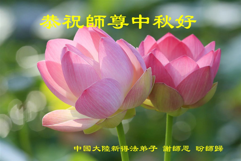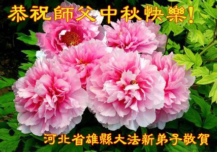 感恩师父对我们的慈悲救度!二十五年前是您把宇宙大法传给了众生,茫茫苦海中的我们从此找到了回家的路,您把有缘人领到我面前让她们得救,并且有几位参加学法炼功,我们无以回报师父给予我们的付出,只有遵照师尊安排的三件事。修好自己多救众生,互相配合,走好走正最后的路,勇猛精進,报师恩。 江苏南通新学员学法小组恭祝慈悲伟大的师尊中秋节快乐! 感谢浩荡佛恩的师尊用巨大的承受和付出、劳苦救度弟子和无量众生,觉的相见太晚新学员弟子无以为报,对师尊的感恩无法用尽人间语言来表述,弟子只能用更加精進、更加努力学好法、炼好功来报答师尊的慈悲苦度。 吉林省辽源市东丰县新得法弟子恭祝师尊中秋节快乐!