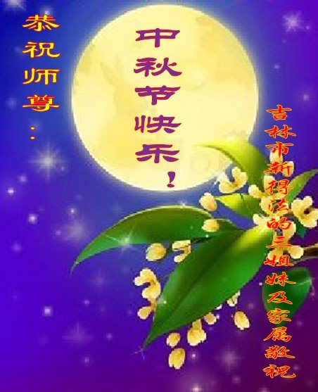 尊敬的师父您好!您辛苦了!我得法两年多了,是您把一个从年龄有多大病龄就有多长的我,净化到无病一身轻的健康状态。弟子无以言表对师尊的感恩,弟子唯有坚持好好修炼,做师父的真修弟子。在这中秋传统佳节里,弟子遥祝师尊中秋快乐! 吉林市新得法的三姐妹及家属敬祝慈悲伟大的师尊中秋节快乐!