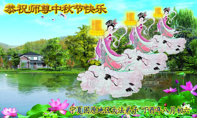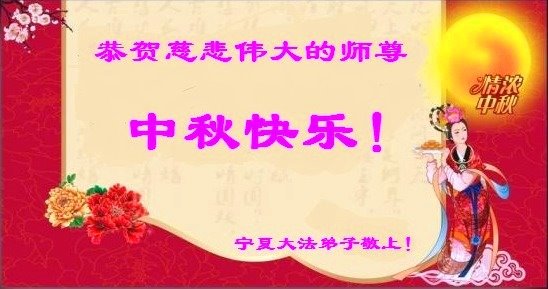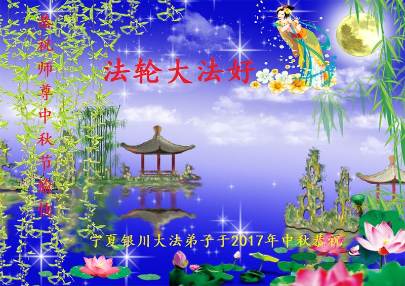 宁夏全体大法弟子恭祝师尊中秋快乐!恭祝师尊中秋快乐,感恩师尊慈悲苦度!请师尊加持弟子们“中秋添正念”,精進实修,做好三件事,多救人,圆满回家。 弟子叩拜 宁夏全体大法弟子敬上 二零一七年九月三十日