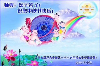 【明慧网二零一七年十月四日】 辽宁省葫芦岛市新区一八十岁的年轻弟子恭祝慈悲伟大的师尊中秋节快乐!师尊您好!您辛苦了!弟子想念您!弟子叩谢师恩!谢师尊慈悲苦度!