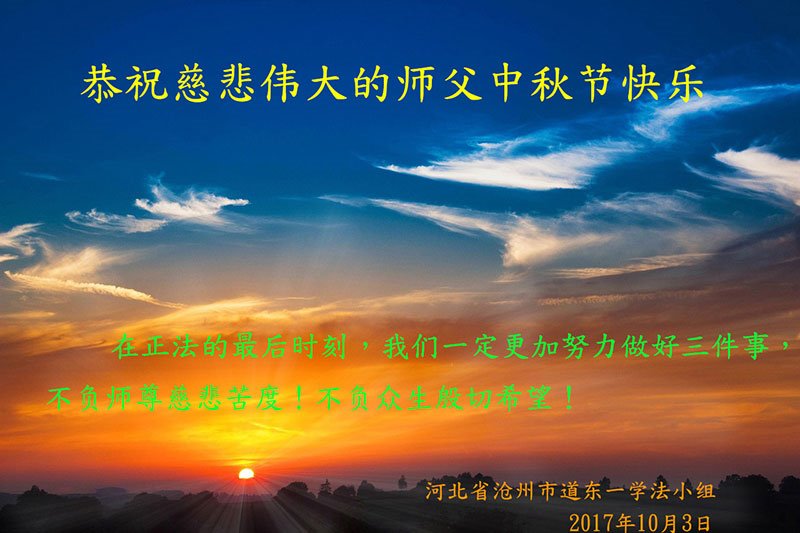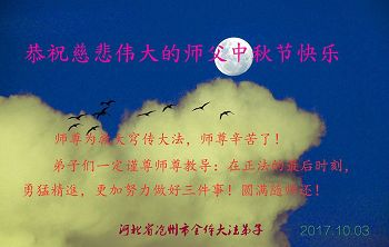 二零一七年十月一日 正法走到最后,弟子只有做好三件事,来回报师尊的慈悲苦度,去掉执着,跟上正法進程。 山东大法弟子全家恭祝师尊中秋快乐!