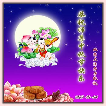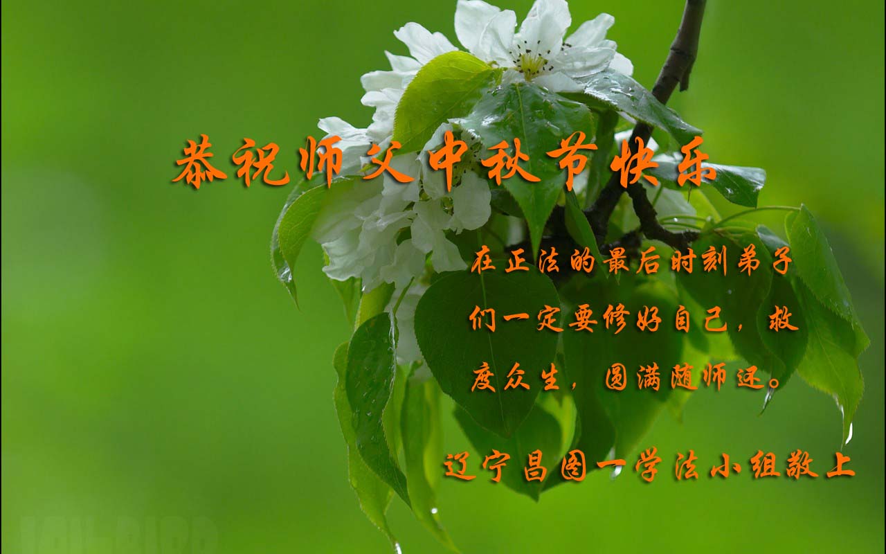 恭祝: 慈悲伟大的师父中秋节快乐! 师父慈悲大法传 冲破万阻宙宇蓝 朵朵祥云喜相伴 福泽万物至永远 值此金秋佳节时 共祝愿: 慈悲伟大的师父 中秋佳节快乐! 辽宁昌图一学法小组恭祝师父中秋快乐!