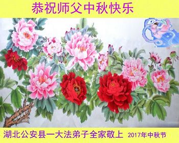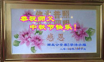 尊敬的师父,您好! 我们湖北省公安县一学法小组的学员祝师父中秋节快乐! 我们的小组多数是老年同修,每天按部就班出去救人,兑现自己的誓约,在救人的过程中,还是有很多放不下的执着在干扰着救人。请师父放心,我们一定踏踏实实修好自己,做好三件事,跟师父回家。 以上十字绣(感恩)的图,它表达着我们小组的学员对师尊的一颗敬仰而感恩的心。十字绣的每一针每一线,都连着我们大法弟子的心。 我们再次恭祝师父中秋节快乐! 2017年中秋节 湖北省荆州市公安县一大法弟子全家恭祝师父中秋快乐!