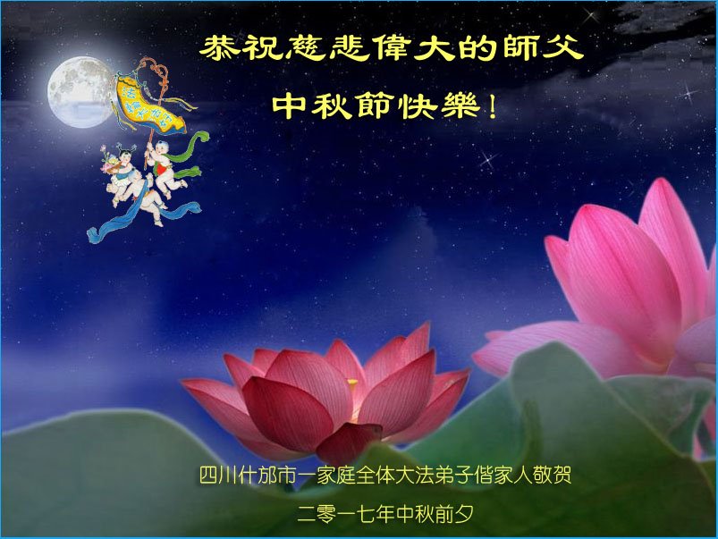 四川省德阳市什邡市一家庭全体大法弟子偕家人恭祝慈悲伟大的师父中秋节快乐!