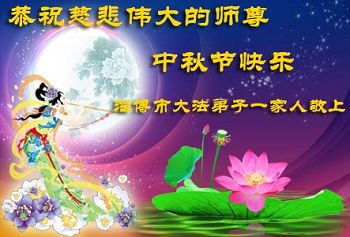 河北省景县一夫妻大法弟子及家人叩拜师尊!谢谢师尊的慈悲苦度、慈悲呵护!弟子不管修炼的路还有多长,时间还有多久,都紧跟师父坚修大法到底,不辜负师尊的慈悲苦度,走正走好最后的路。让师尊多一些欣慰,少一些操劳。 中国大陆湖北荆门学法小组大法弟子恭祝师尊中秋快乐!