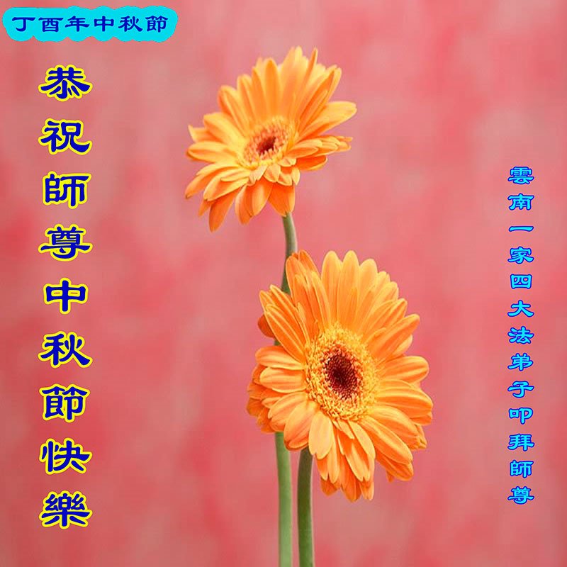 师父:您好!感恩师父的慈悲苦度。沐浴法光,同化大法的愉悦,清除邪恶,救度众生轻盈,使我们深深体会学好法的重要!我们一定会共同精進,做好三件事,圆容师父要的,让师父放心,做个合格的新宇宙中正法正觉的新生命! 云南一家四大法弟子叩拜师尊!恭祝师尊中秋节快乐!
