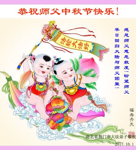 师父辛苦了!您为弟子承受太多太多,弟子们深知这延续来的时间是您给大法弟子修炼与救度众生的,众生感受着师尊的慈悲。我们一定做好三件事,形成整体,广传真相,多救众生,让师父欣慰! 湖北省荆门市大法弟子恭祝师尊中秋快乐!