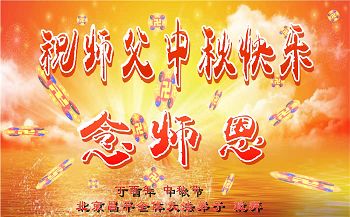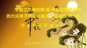 尊敬的师父:值此中秋节前夕,向师父问好!感谢师父对我们的救度与呵护,使我真正的成为一名大法弟子,并走好最后的路。祝师父节日快乐! 丰台、海淀俩大法弟子及各全家明真相家庭成员向师父恭祝中秋节快乐!