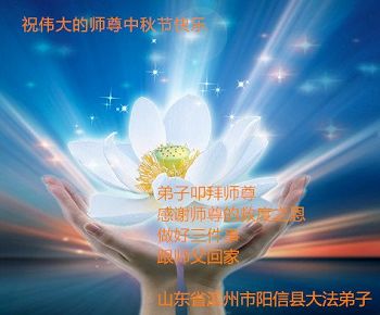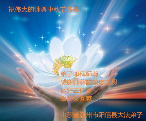 师尊您好! 我们一定要学好法,修好自己,完成好救度众生的重大使命,不辜负师尊的期望。 合十 跪拜师尊 山东省滨州市惠民县全体大法弟子恭祝师尊中秋节快乐!