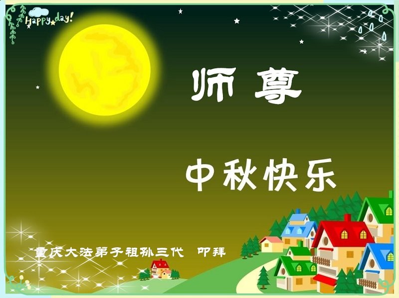 每想起是慈悲伟大的师尊把业力满身的一个个我,从地狱中捞起,为我们付出,为我们承受…,我们热泪盈眶,我们唯有踏踏实实的修炼,整体配合、精進做好三件事,多救人…,以实际行动兑现自己的承诺,叩拜慈悲伟大的师尊中秋快乐! 上海普陀区全体大法弟子 重庆江北祖孙三代恭祝师父中秋节快乐!