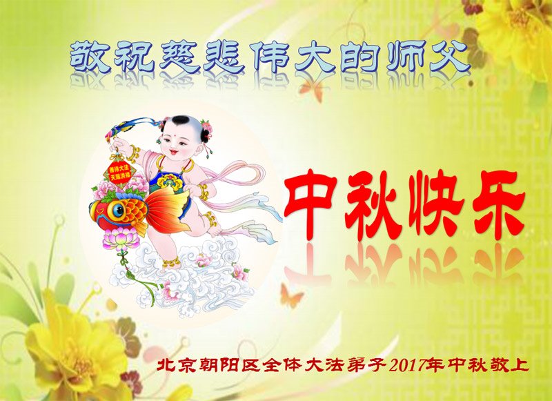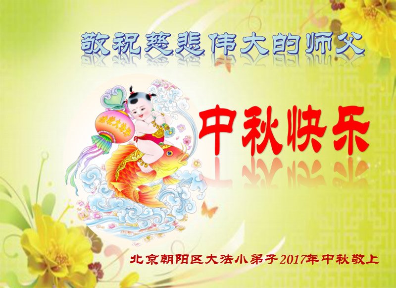 我们清醒的知道自己肩负的责任,弟子们一定坚持努力做好三件事,去人心、去执着,多救人。全盘否定旧势力的一切安排,破除邪恶的间隔,圆容好整体。千言万语道不尽对师尊的感恩,此时此刻,已经止不住感恩的泪水——弟子们想念您!师尊您辛苦了! 北京市朝阳区大法弟子和大法小弟子恭祝慈悲伟大的师父中秋快乐!