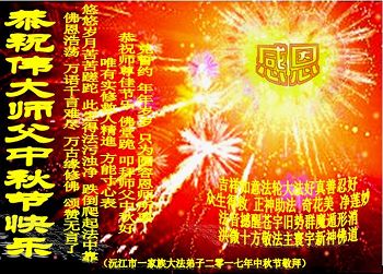 祝李大师中秋快乐! 法轮功学员告诉我要牢记“法轮大法好”“真善忍好”九字真言,感谢您李大师也感谢您的弟子对我的关心。马上中秋节就要到了,我恭祝李大师中秋佳节快乐! 北京怀柔区明真相世人敬上 |