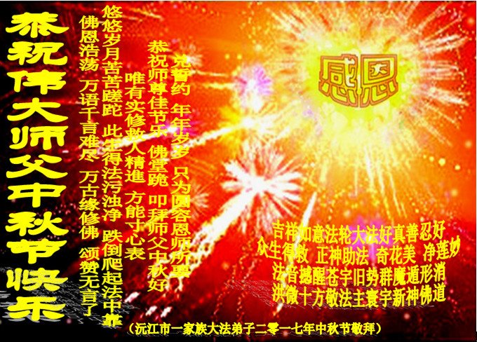 尊敬的师父:您好! 我们喜得大法修炼至今已十九载有余,漫长的风雨历炼过程中,不争气的弟子就象跚跚学步的孩子,跌跌撞撞,摔跤、爬起、走正。在做的好、做不好中,是慈悲师父不离不弃的呵护我们走到了今天。弟子让师父您操碎了心,此时此刻,深深愧疚、无限感恩,难言表…… 未来助师正法的路,无论时日长短,弟子一定虔心记住师父《关于副元神一文引起的波动》:“面对负面的乱象表现,没什么可波动的。学好法、做好三件事,什么都有了。其实旧势力已经被定为正法的魔在清理中了。有师在、有法在,乱不了”的法警醒自己,精進、精進、猛精進,净心背法向内修,理性讲真相,智慧多救人,圆满随师还! 谨借中秋月圆夜,佛堂合十跪拜九叩首 ,叩谢师尊慈悲苦度! 湖南省沅江市一家大法弟子敬上(二零-七年中秋节) 天津滨海大港母女大法弟子丁酉年中秋遥祝师父中秋快乐!