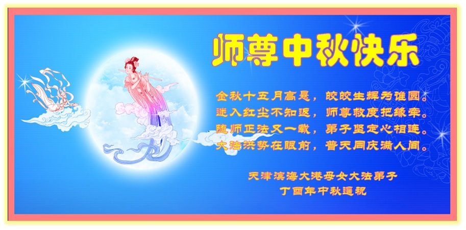 天津滨海大港母女大法弟子丁酉年中秋遥祝:师父中秋快乐! 金秋十五月高悬,皎皎生辉为谁圆。 迷入红尘不知返,师尊救度把缘牵。 随师正法又一载,弟子坚定心相连。 大法洪势在眼前,普天同庆满人间。 弟子叩拜师尊! 黑龙江哈尔滨大法弟子恭祝师尊中秋快乐!