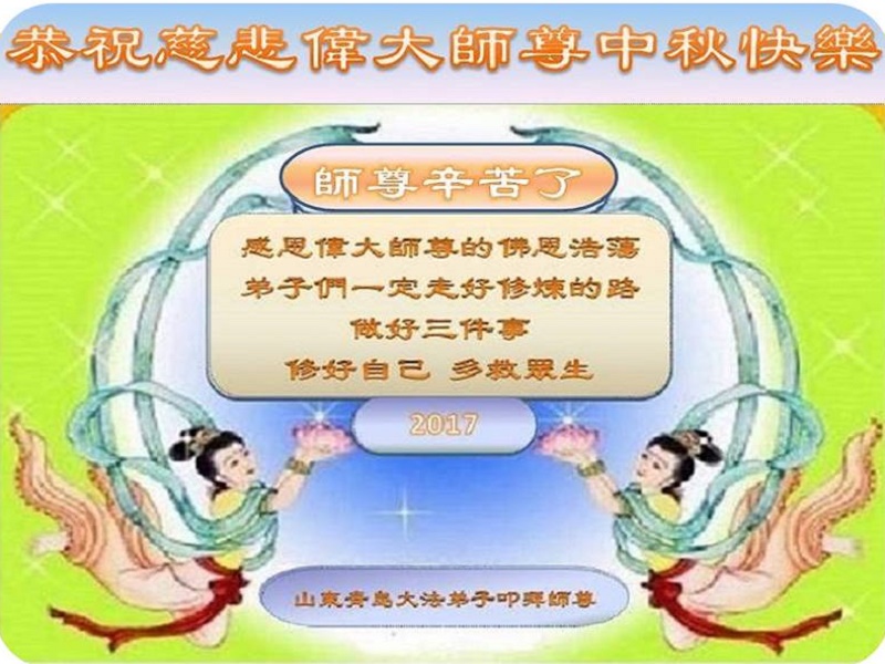 我们一定要听师父的话,不走旧势力安排的路,找回修炼如初的状态! 栖霞大法弟子 栖霞市全体大法弟子恭贺慈悲伟大的师尊中秋节快乐!