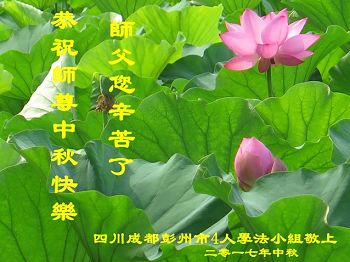 每逢佳节倍思亲、一年一度的中秋节又到了,在这个全中国合家欢庆团圆的日子里,弟子们更加想念师尊。希望早一天与师尊团聚。 郫县大法弟子 四川成都彭州市4人学法小组大法弟子恭祝师尊中秋节快乐!