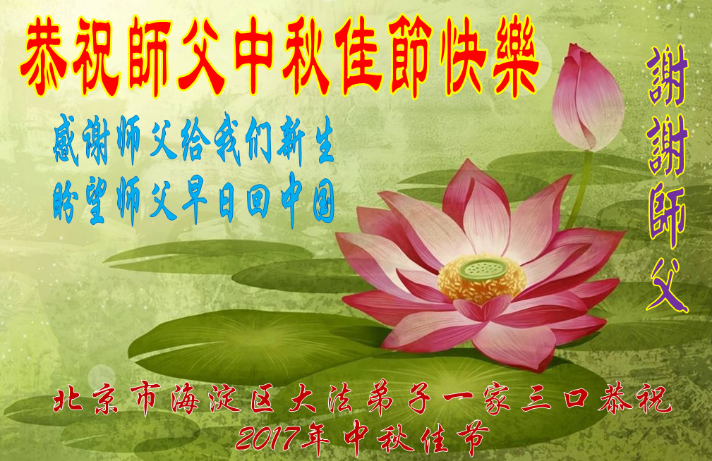 谢谢师父!恭祝师父中秋佳节快乐!感谢师父给我们新生,盼望师父早日回中国! 北京市海淀区大法弟子一家三口恭祝 2017年中秋佳节 山东威海大法弟子恭祝师父中秋节快乐!
