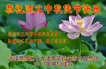 师父好!恭祝师父中秋佳节快乐!感谢师父对弟子的慈悲救度!盼望师父早回中国,我们想念您! 武汉黄陂区一大法弟子携全家六口恭祝 2017年中秋佳节 辽宁省抚顺市新宾县农村大法弟子老李夫妻祝师父中秋快乐!