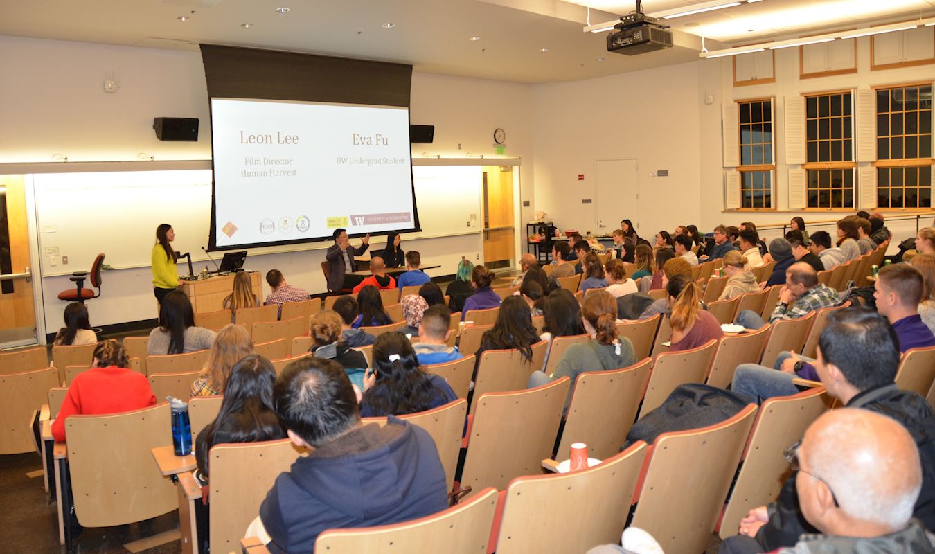 【明慧网二零一七年十一月十六日】2017年11月9日晚,位于美国西部的华盛顿大学西雅图分校(University of Washington - Seattle)举办了2014年皮博迪奖获奖纪录片《活摘》(Human Harvest)的放映会。 图1:华盛顿大学西雅图分校举办获奖纪录片《活摘》的放映会 |