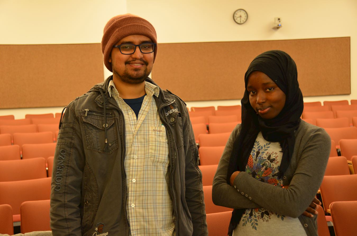 本次放映会的两位主办人分别是华盛顿大学公共事务学院的硕士生Cheryl Yu和Liz Harding Chao,公共事务学院学生组织Partnership for Community and Diversity(PCD)的社长。该记录片的导演李云翔(Leon Lee)为本次活动从温哥华专程赶到现场。在影片放映后的讨论会中,商学院学生Eva Fu分享了作为年轻法轮功修炼者在中国成长时经历的迫害。 此次活动由国际研究学院学生组织,华盛顿大学人权中心等校园社团赞助,华盛顿大学校报UW Daily和国际审查员(International Examiner)等当地媒体都对此次活动进行了报导。观众席中大部份都是华大的学生及教授。电影放映后观众反响热烈,很多人都希望了解更多细节,并询问怎样做才能尽早制止活摘器官的罪行。 两位华大的学生Kate和Susan(化名)一同来观看电影。放映后,在接受采访时,Kate说:我曾看过一部电影,里面讲到了活摘器官是未来可能会发生的事情,并描述了那将会是怎样的情形。我那时想,这是现实世界中绝对不可能发生的事情。我曾经也听说过黑市器官非法贩卖,但我从未听说过居然是一个国家的政府如此大规模的在幕后主导操控这一切。今天,看过《活摘》这部电影后,我感到极为悲痛。我还是难以相信这在当今社会真实发生着。我从不知道。我庆幸我现在了解了。我认为这部纪录片必须要被传播出去,人们必须要了解活摘。就如导演在问答讨论中一直提到的:知识就是力量。对于没有看过这部电影的人们,我想说:“你是否知道,在中国大陆,政府为牟取暴利强摘活人器官屠杀无辜?这是滔天的罪恶!” Susan说:我以前没听说过活摘器官。这绝对是出乎意料的。我从未预料到情况是如电影中所述那样的严重。我认为人们必须要知道电影中纪录的这一切。“每个人一定要至少看一次,这是一部深深启迪人心的电影!” 5位来自Shoreline Community College的学生应一位朋友邀请来观看放映,他们中的4位分享了参加今天活动的感想。  图2:Aung(左)和Fatoumata |