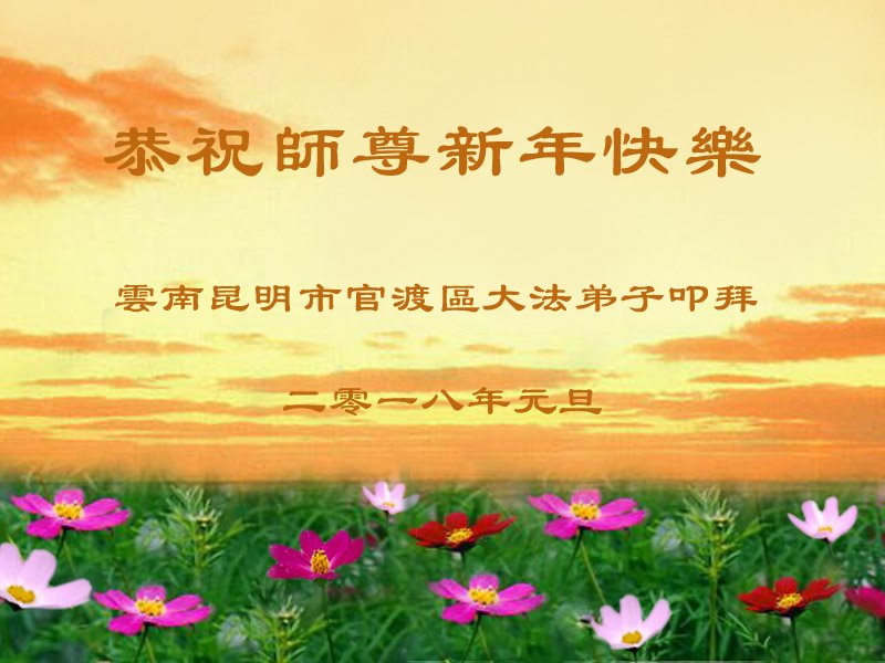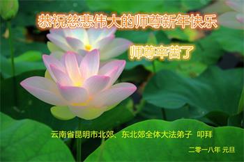 恭祝师尊新年好、新年快乐! 在这辞旧迎新之际,昆明北郊、东北郊全体大法弟子衷心感谢恩师的慈悲救度之恩,在正法的最后时刻,在师尊的慈悲呵护下,我们越到最后越要精進 ,扎扎实实的修好自己,多救众生,圆满随师还。 昆明市大法弟子恭祝师尊元旦快乐!