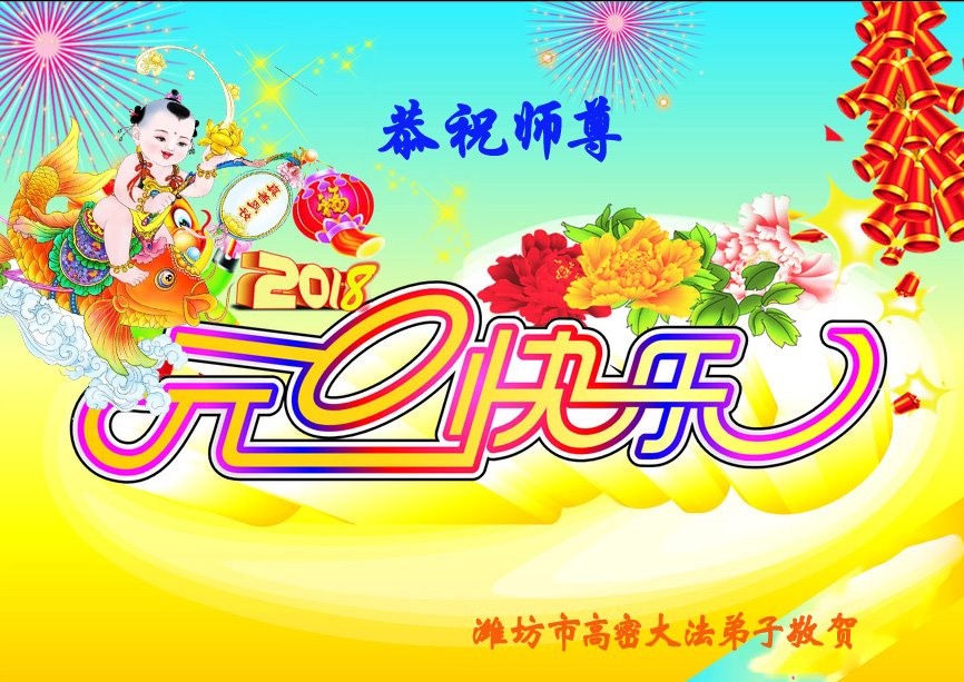我们共同合十向慈悲伟大的师尊恭祝师尊新年快乐!在新的一年里少受操劳,多添欣慰。 同时,弟子时刻谨记师尊教诲,做好三件事,随师回家。 师恩颂 百年红祸毁大陆,娼淫遍地黄赌毒。坑蒙拐骗假恶斗,道德沦丧人性无。 灌输无神邪魔论,進化使人更邪乎。愚迷无神毁真念,毁弃神赐回归路。 天际飞来法轮舞,师传大法撒甘露。佛恩浩洪救生命,三字真经天梯铺。 大法破开层层雾,修心去执正悟出。三事共做勤内找,名利情恨皆个去。 师尊铺好回天路,佛恩浩荡救世主。莫负师恩慈悲护,来世洪愿快兑付。 名利情恨谁能去,唯有旷世大法徒。幸修大法耀宗祖,恭祝师恩苦救度。 愿师欣慰少操劳,盼师早日回中土。华夏弟子师恩颂,二零一八新年书。 山东省潍坊市高密市西南乡全体大法徒共同合十 敬上 山东省潍坊市昌乐县一大法弟全家恭祝慈悲伟大的师尊元旦快乐!