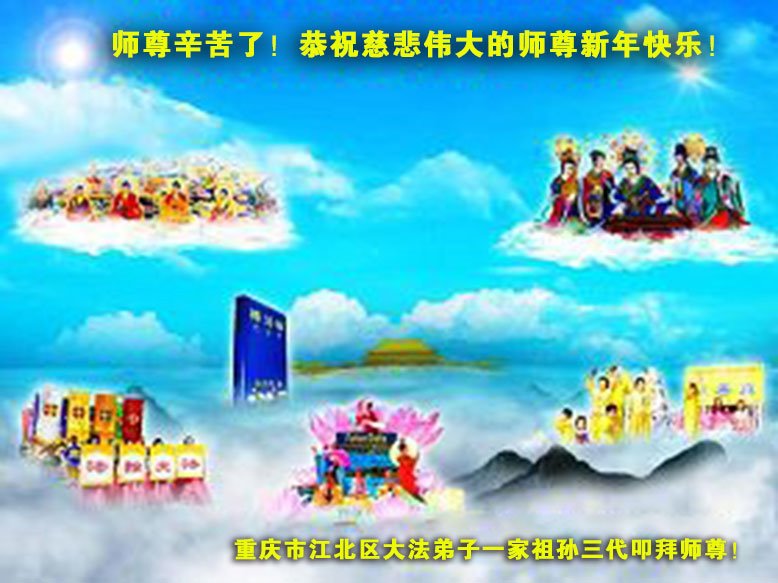 光阴似箭,日月如梭。转眼新的一年又来了,在这新年佳节普天同庆同祝同颂大法无限美好的日子里,弟子们叩拜无量慈悲伟大的师尊!回首过去的日子,弟子们沐浴在师尊的无量慈悲和宇宙大法的佛光之中,感到无上荣光和幸福!师尊为弟子承受了无尽的魔难,吃了无尽的苦。万分感激师尊的救度之恩!这浩荡洪恩弟子无以回报,只有在这最后宝贵的时光里精進,精進,再精進!不辜负师尊的慈悲苦度!学好法,修好自己,救度众生,一定要跟师父回家! 重庆市荣昌区全体大法弟子恭祝师尊新年快乐!