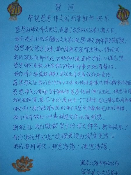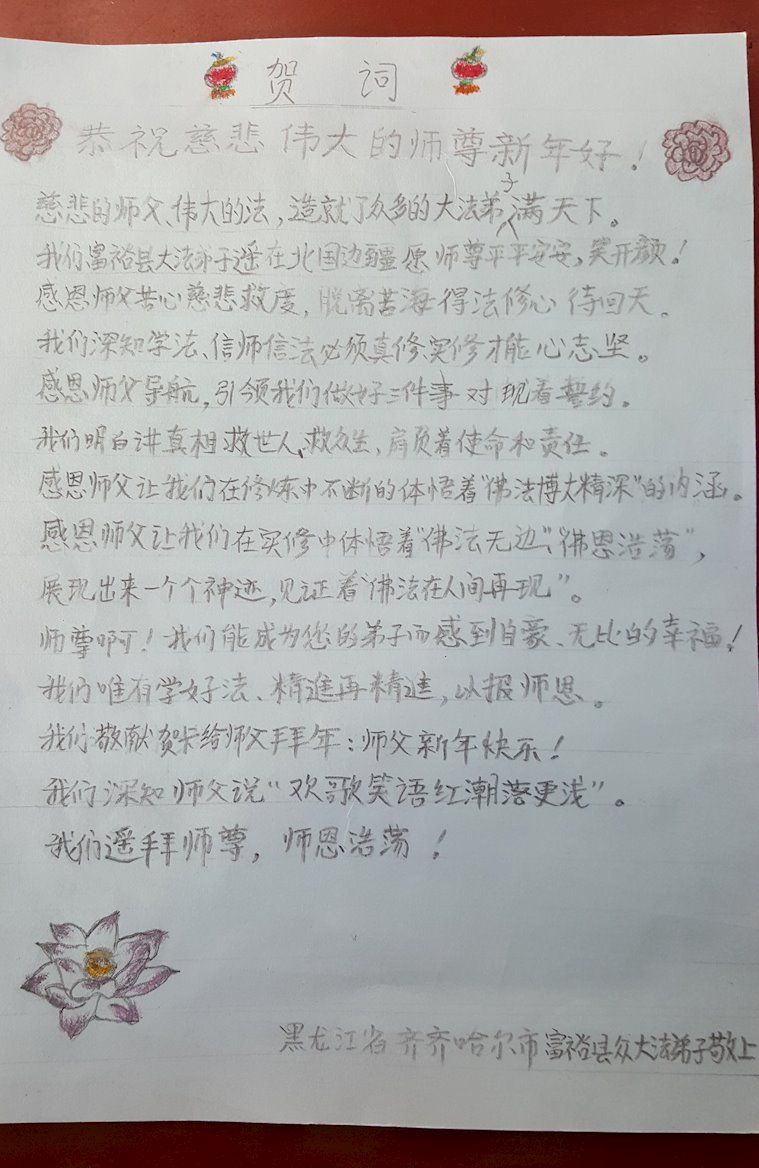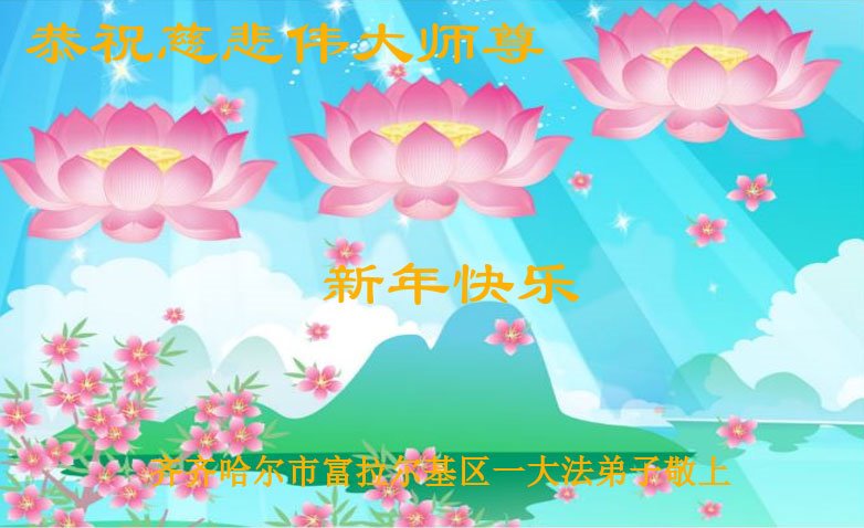 恭祝慈悲伟大的师尊新年好! 慈悲的师父、伟大的法,造就了众多的大法弟子满天下。 我们富裕县大法弟子遥在北国边疆愿师尊平平安安、笑开颜! 感恩师父苦心慈悲救度,脱离苦海得法修心待回天。 我们深知学法、信师信法、必须真修实修才能心志坚。 感恩师父导航,引领我们做好三件事,兑现誓约。 我们明白讲真相救世人、救众生,肩负着使命和责任。 感恩师父让我们在修炼中不断的体悟着:佛法博大精深的内涵。 感恩师父让我们在实修中体悟到的:佛法无边、佛恩浩荡。 展现出来一个个神迹,见证着:佛法在人间再现。 师尊啊!我们为能成为您的弟子而感到无上的自豪、无比的幸福! 我们唯有学好法,精進再精進以报师恩。 我们敬献给师父拜年:祝师父新年快乐! 我们摇敬师尊,叩拜师恩浩荡! 黑龙江省齐齐哈尔市富裕县大法弟子敬上 黑龙江省齐齐哈尔市富裕县大法弟子恭祝慈悲伟大的师尊新年好!