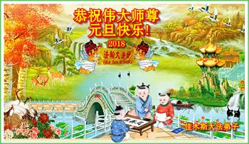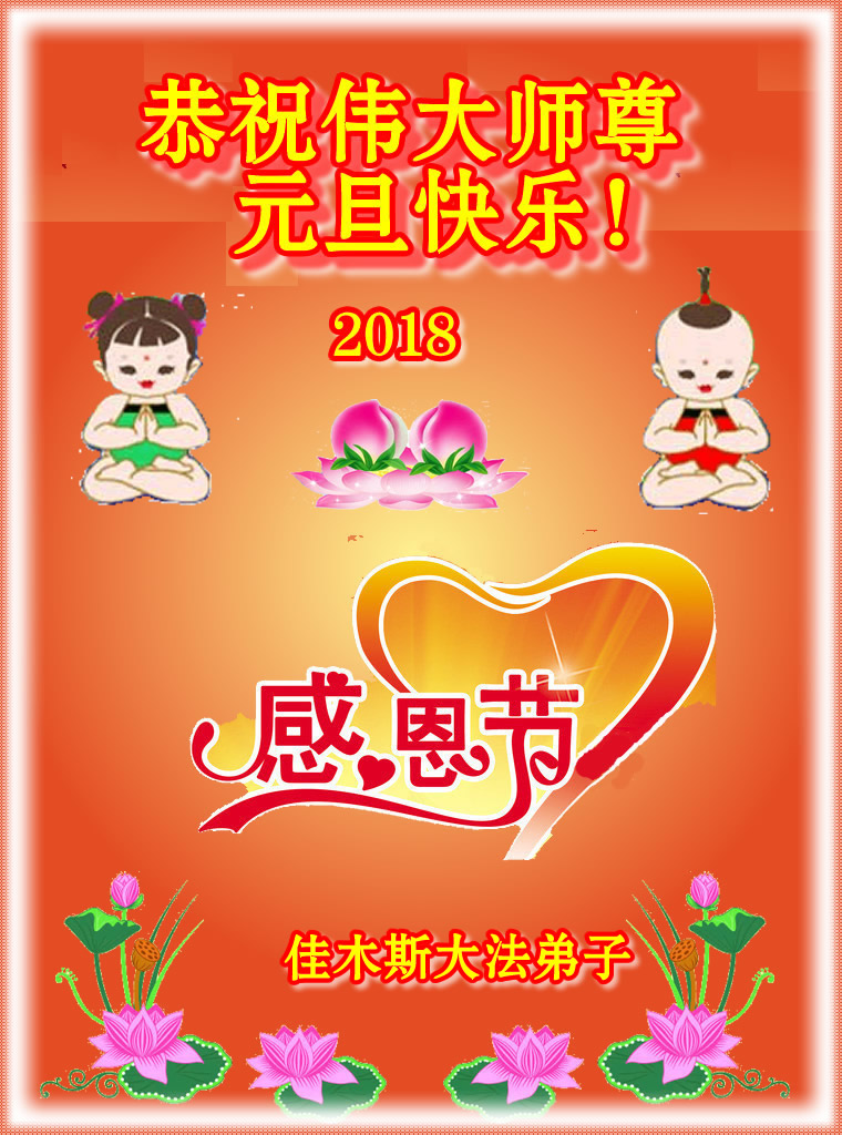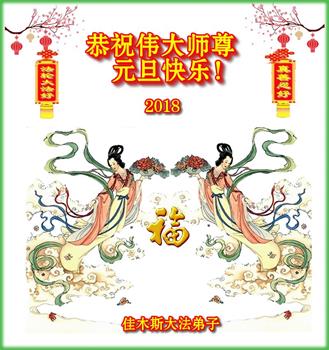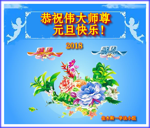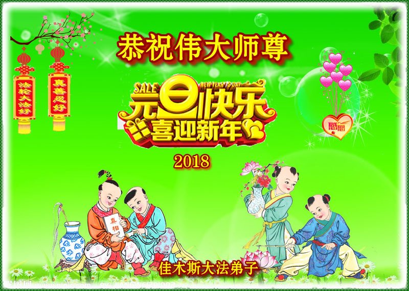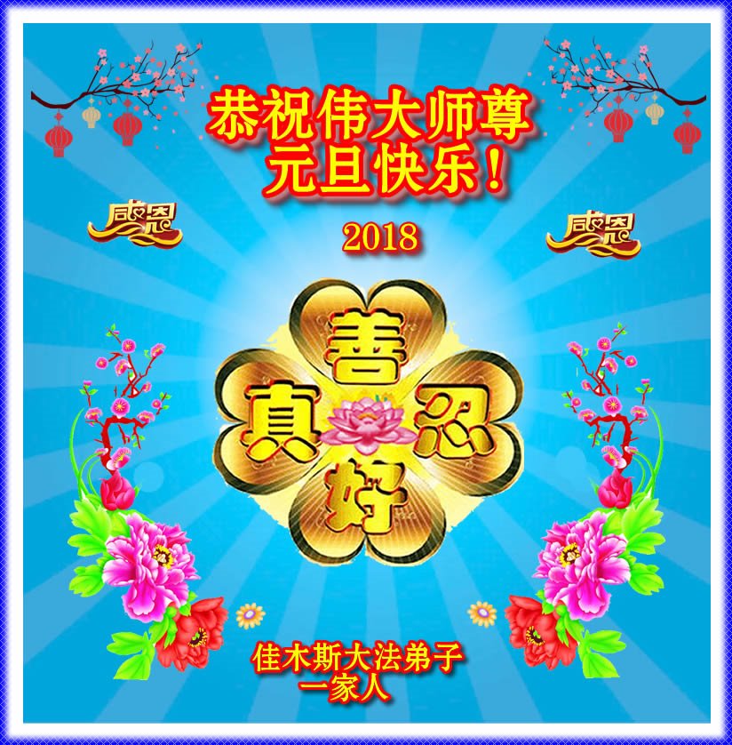 苍宇沐佛光,普照天地新。 法传真善忍,同化者永存。 助师证实法,快讲救世人。 三:退.上法船,时时在救人。 最后更精進,圆满报师尊。 祝师永快乐!叩首谢师尊。 佳木斯大法弟子 2018 元旦 黑龙江佳木斯大法弟子恭祝伟大师尊元旦快乐!