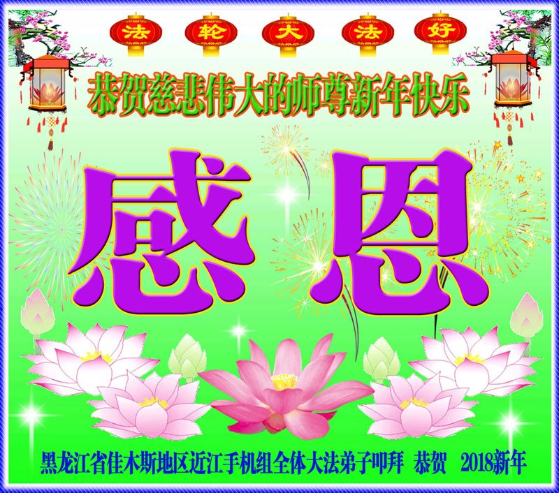 当大法弟子荣幸啊, 能被师父救度回天家 当大法弟子责任也大呀 要救度为法下世的众生 弟子别无选择只有一条路 修好自己多多救度众生 兑现誓约与师同回天庭 佳木斯大法弟子谢师父 黑龙江省佳木斯地区近江手机组全体大法弟子恭祝慈悲伟大的师尊新年快乐!