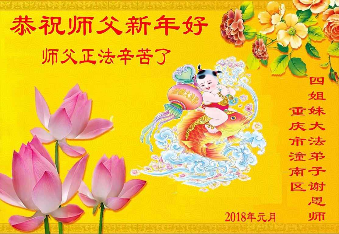 在辞旧迎新,跨入2018年元旦之际,重庆市沙坪区新桥一大法弟子向慈悲伟大的师尊问好:师尊您好!师尊辛苦了!恭祝师尊元旦快乐! 弟子在修炼中,虽然离师尊对大法弟子的要求还很远。但弟子有决心更加努力的精進实修,多学法,事事向内找,忍苦去执着,多救人,做好三件事,完成好自己的史前大愿,随师父回家。 弟子跪拜师尊 合十 重庆市南川区大法弟子祝师尊新年好!