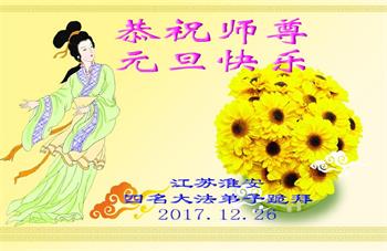 感谢师尊救度之恩! 江苏淮安莲花等四名大法弟子跪拜 江苏淮安一学法小组全体大法弟子恭祝师尊元旦快乐!
