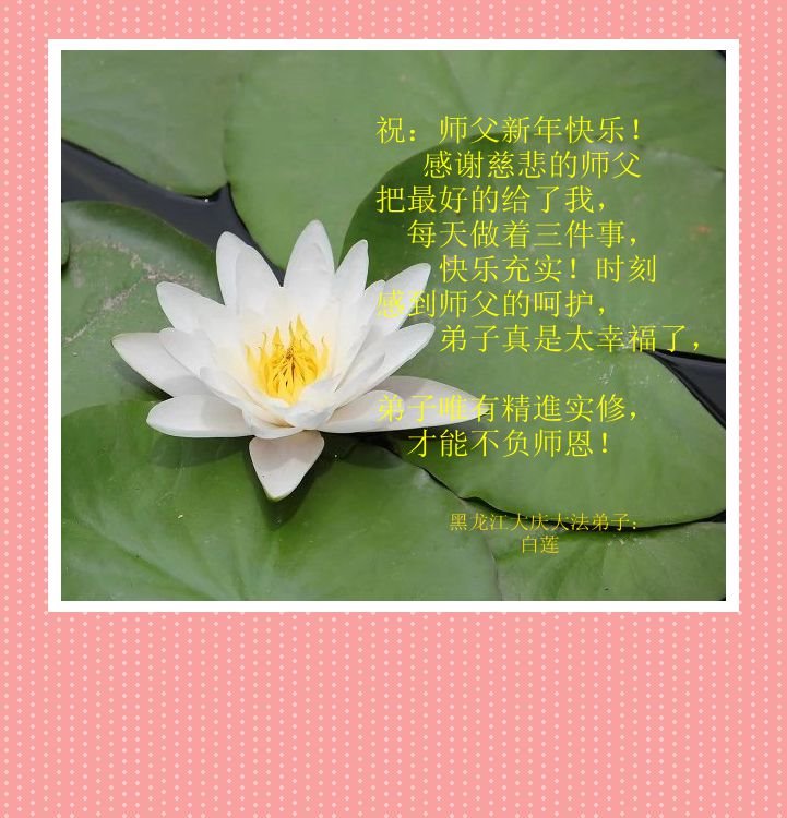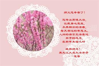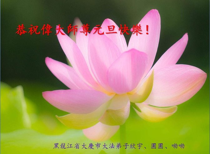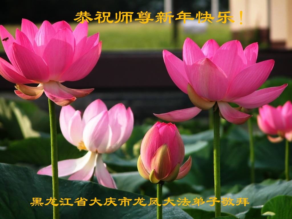 祝师父新年快乐!师父,弟子非常想念您,盼望您早日回到大陆来。谢谢师父的慈悲苦度。 黑龙江省大庆市龙凤大法弟子敬拜 黑龙江省大庆市龙凤区大法弟子恭祝师尊新年快乐!