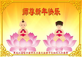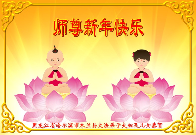 黑龙江省哈尔滨市木兰县大法弟子夫妇及儿女恭祝师父新年快乐!