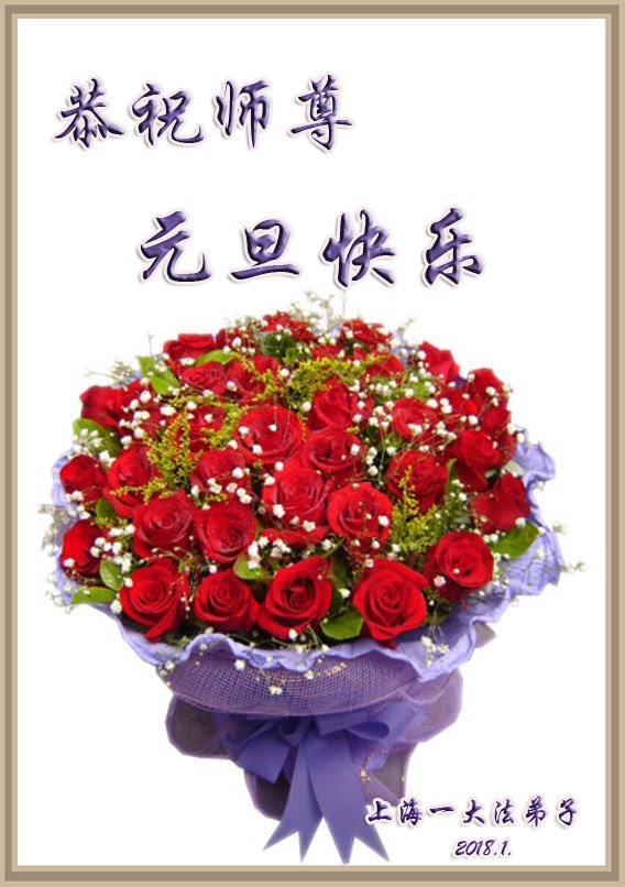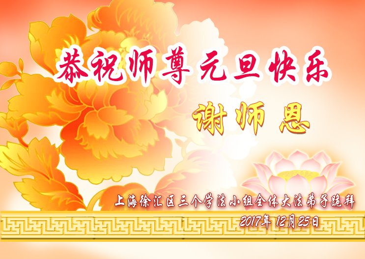 师父您好!您辛苦了!在这邪恶的环境中您又引领我们走过这风风雨雨的一年。在新的一年里,我们将以法为师,在师父的呵护下正念正行,稳健的走好正法之路。 谢谢师父的慈悲苦度! 上海大法弟子敬上 2017年12月26 上海大法弟子恭祝师尊元旦快乐!