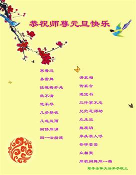 恭祝慈悲伟大的师尊新年快乐! 山东省昌邑市全体大法弟子恭祝慈悲伟大的师尊新年快乐!感谢师父为的无比承受与慈悲呵护,弟子们想念师父,盼师父早日回国! 山东省大法弟子恭祝师尊元旦快乐!