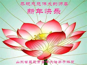 师父!您好!恭祝您新年快乐! 我是山东昌邑市的一名法轮功学员,虽然自己修炼的不好,但我遇到了千年万年的宇宙大法,我会坚持不懈的修炼下去。今后,我一定会努力好好修炼,把一切人心彻底去掉,遇到矛盾向内找找自己的不足,静下心学好法,多救人,努力做好三件事。一定跟您回家! 弟子发自内心感谢师尊的慈悲救度!没有您的慈悲救度,我活不到现在,有很多话想跟您说,但不知如何表达,只有勇猛精進报师恩! 山东昌邑一大法弟子叩拜! 山东潍坊高密大法弟子祝师尊新年快乐!