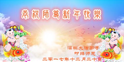 师父您好!我们很幸运、很荣耀能成为师父的弟子。师尊对众生的慈悲苦度,用尽人间所有的语言都表达不尽。作为弟子要信师信法,听师父的话,以法为师,做好三件事,才能敬师敬法,才能跟师父回家。 广东省深圳大法弟子恭祝师尊新年快乐!