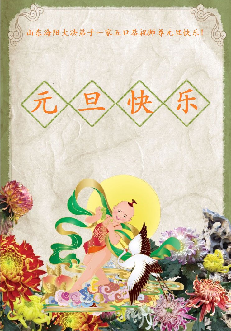 慈悲伟大的师尊您好!四个学法小组全体大法弟子恭祝师尊元旦快乐!我们都知道时间的紧迫,师尊的急待,众生的期盼,自己肩负的重任,在最后的时间里,都决心在修好自己的同时,救度众生,兑现誓约,要师尊所要的。 山东省威海市环翠区大法弟子祖孙三代叩拜恭祝师尊元旦快乐!