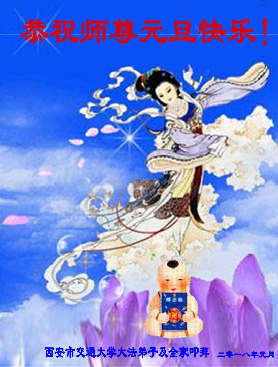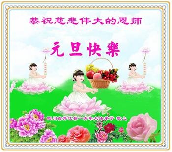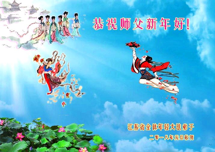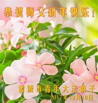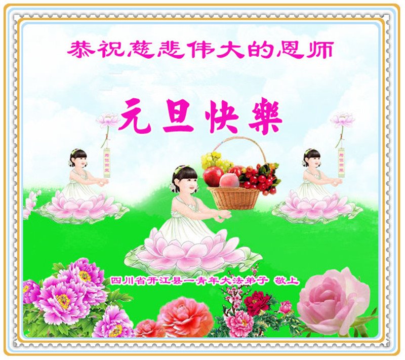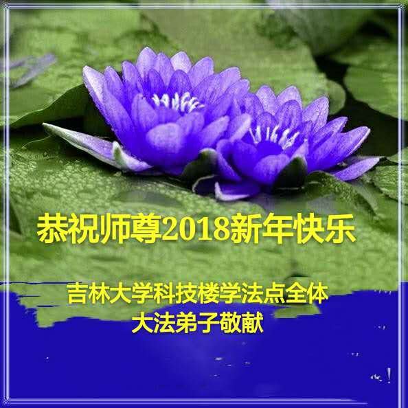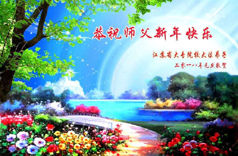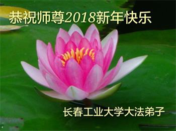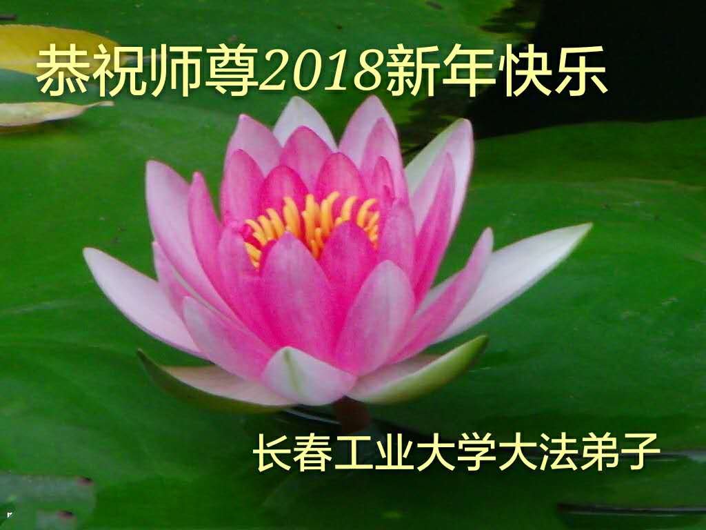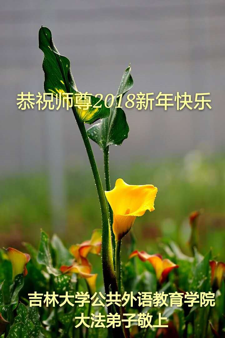 | 【明慧网二零一七年十二月三十一日】2018年元旦来临,明慧网收到了来自中国大陆各地高等院校青年学子、来自十余省各行业青年大法弟子敬献师尊的新年祝贺,恭贺师尊新年好,元旦快乐! 北京丰台区青年大法弟子感恩师父,他说,“没有师父对弟子如此多的付出与慈悲苦度,我就不可能从那种过于消极的状态变成如今的乐观向上,成为大法造就的全新生命。” 一位大连大法弟子在贺信中对师父说,“我曾经是您的小弟子,在大法中修炼已经十几年,如今已成长为青年弟子。大法让我学会了思考如何做人,在修炼的路上,有师尊的慈悲护佑和大法的指导,让我不断的提高心性,明法理,真正成为一个好人,学会了如何做一个合格的修炼人。” 河北石家庄市平山县一大学生大法弟子恭祝师父元旦快乐!师父好!我是石家庄市平山县的一名即将二十岁的青年大法弟子,在外地上大学,从小修炼。在此恭祝师父元旦快乐!弟子向您保证,在修炼中,我会严格、更加严格要求自己,绝不辜负师父的厚望,一定会功成圆满! 师父,您把我们从地狱里捞出来,帮我们消去如山的罪业,把我们洗净,教我们法理,给我们下上宇宙中最珍贵的法轮,无偿给予我们的全是最好的,这是创世以来前所未有的慈悲。当初我们就像不懂事的孩子一样,由您手把手拉扯大,如今我们成熟了。听师父讲法的时候,弟子常常泪流满面,而无以言表。弟子只有修好自己谢谢师父,这便是对恩师的最大回报了吧!师父,我们大陆的弟子们想念您哪! 湖南科技大学大法弟子恭祝慈悲伟大师尊新年快乐!吉林大学哲社学院大法弟子恭祝师尊2018新年快乐!湖南高校大法弟子恭祝慈悲伟大师尊新年快乐!穹宇中的小草向您叩首 慈悲伟大师尊新年好! 湖南高校大法弟子 合十 黑龙江省全体青年大法弟子恭祝慈悲伟大的师尊新年快乐!黑龙江省全体青年大法弟子恭祝慈悲伟大的师尊新年快乐! 阮郎归·感恩越重洋 肺腑感恩越重洋 遥寄明慧网 感恩一路师导航 弟子诚敬上 谢师恩 解迷茫 得度沐法光 谨遵师教心亮堂 救众返天乡 黑龙江省伊春市青年大法弟子恭祝慈悲伟大的师尊新年快乐!长相思·快明真言 千年盼 万年盼 今生得法来世间 师尊大法传 你有缘 我有缘 看到真相是机缘 快快明真言 湖南青年大法弟子恭祝慈悲伟大师尊新年快乐!黑龙江省安达市青年大法弟子恭祝师尊元旦快乐!恭祝师尊元旦快乐! 谢 师 恩 迷 途 为得大法从天来 层层下走结圣缘 迷途知返修大法 勇猛精進返天宫 黑龙江省安达市青年大法弟子敬上 黑龙江大兴安岭松岭区青年大法弟子恭祝师尊元旦快乐!北京青年大法弟子恭祝师尊新年快乐!重庆市潼南区一青年大法弟子恭祝师父元旦快乐!湖南湘潭科技大学恭祝慈悲伟大师尊新年快乐!弟子叩谢师恩,感谢师尊慈悲救度! 西安市交通大学大法弟子及全家恭祝师尊元旦快乐!西安市交通大学全体大法弟子恭祝师尊元旦快乐!湖北省咸宁市高校大法弟子恭祝师父元旦快乐!感恩 师父正法救苍宇, 万险巨难一肩担, 延长时间为众生, 新宇佛道神谢恩。 咸宁市高校大法弟子跪拜 戊戌年元旦 江苏省全体青年大法弟子恭祝师父2018年新年好!创世法王下凡界 广传大法救世间 今生有缘得天法 谢师洪恩苍宇间 法王救众飞云天 天女散花花飞艳 众生得救谢师尊 大穹更新辉煌现 山东省诸城市青年大法弟子恭祝师父新年快乐!辽宁省抚顺新宾青年高校大法弟子恭祝师父新年好!北京丰台区青年大法弟子祝慈悲伟大的师父元旦快乐!没有师父对弟子如此多的付出与慈悲苦度,我就不可能从那种过于消极的状态变成如今的乐观向上,成为大法造就的全新生命。您给了我灵活的能力,将一个死读书的我变的灵活,在这里弟子发自内心的说一声:“师父您辛苦了!感谢您的慈悲苦度!在新的一年里,弟子一定要努力做到言行一致,努力同化大法,找回如初的修炼状态,并尽力把这好的状态坚持到最后,勇猛精進跟师父回家。 弟子再次敬祝师父元旦快乐!惟愿师尊笑! 北京丰台区青年弟子跪拜敬上 湖南湘潭大学大法弟子恭祝慈悲伟大师尊新年快乐!吉林长春工业大学大法弟子恭贺师尊新年快乐!吉林大学公共外语教育学院大法弟子恭祝师尊2018新年快乐!修炼如初,勇猛精進!感恩师尊无量慈悲与对弟子的珍惜! 吉林大学科技楼学法点全体大法弟子恭贺师尊2018新年快乐!东北师范大学大法弟子恭贺师尊2018新年快乐!吉林大学数学学院大法弟子恭贺师尊2018新年快乐!吉林大学全体大法弟子恭贺师尊2018 新年快乐!黑龙江省佳木斯市佳木斯大学大法弟子及家人恭祝师尊新年快乐!北京高校大法弟子恭祝师父新年好!法轮大法好! 湖南高校大法弟子恭祝慈悲伟大师尊新年快乐!湖南高校大法弟子叩拜慈悲伟大的师尊!合十 二零一七年十二月十七日 江苏省大专院校全体大法弟子恭祝师父新年快乐!秦王想走神仙路 童男童女蓬莱住 无奈机缘未到时 化作泡影无归途 法王今世开天路 喜搭彩桥铺神路 天门敞开机缘显 一梦万年终归途 二零一八年元旦敬贺 内蒙赤峰市青年大法弟子恭贺师尊新年快乐!河北阜平县一青年大法弟子恭祝慈悲伟大的师尊新年快乐!中国科技大学全体大法弟子和家人恭祝师尊新年快乐!中国科技大学全体大法弟子在新年到来之际,叩拜师尊!在正法的最后时刻,法正人间在即,在新的一年里弟子们更要珍惜师尊延续来的时间,整体配合好,做