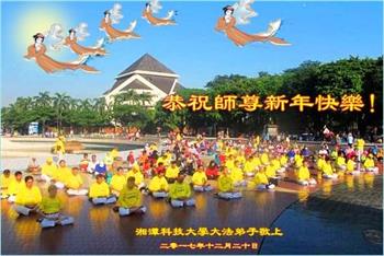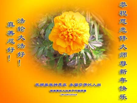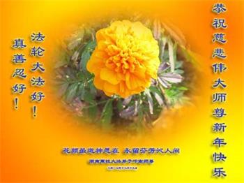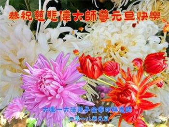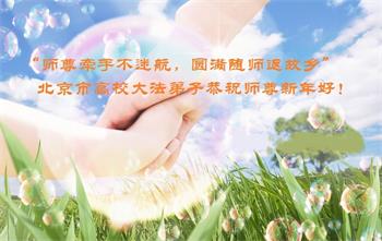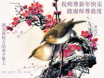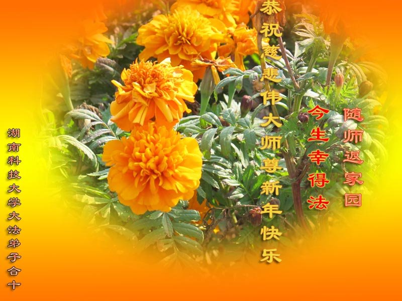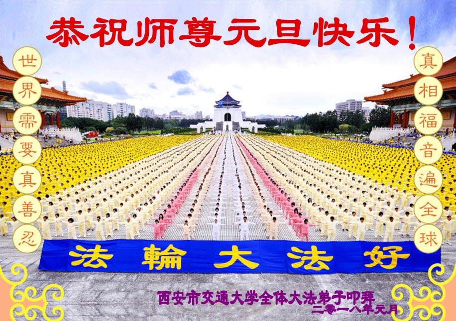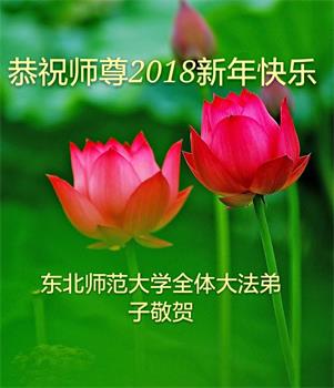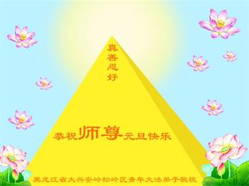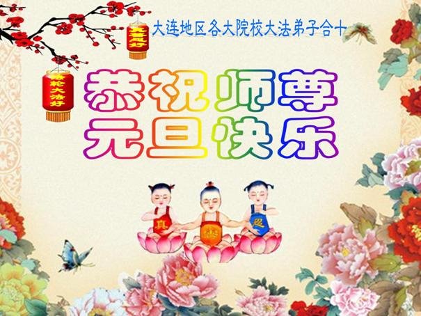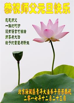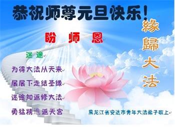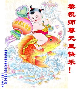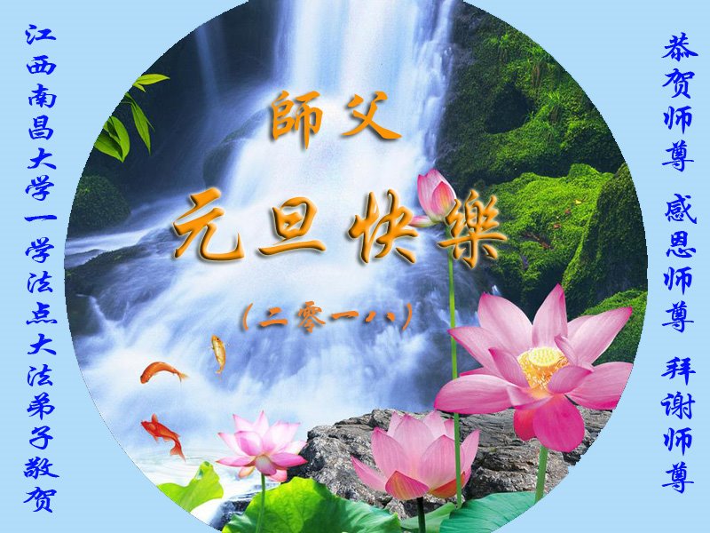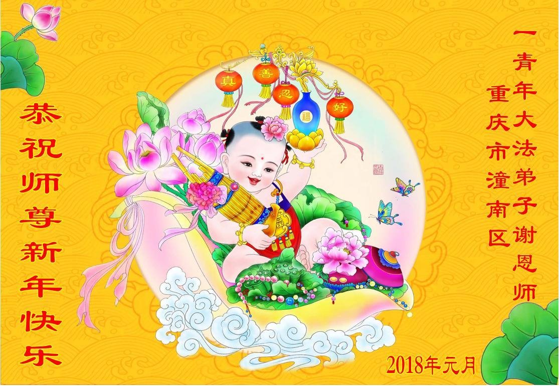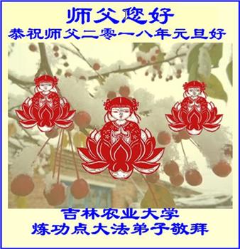 | 【明慧网二零一七年十二月三十一日】2018年元旦来临,明慧网收到了来自中国大陆各地高等院校青年学子、来自十余省各行业青年大法弟子敬献师尊的新年祝贺,恭贺师尊新年好,元旦快乐! 北京丰台区青年大法弟子感恩师父,他说,“没有师父对弟子如此多的付出与慈悲苦度,我就不可能从那种过于消极的状态变成如今的乐观向上,成为大法造就的全新生命。” 一位大连大法弟子在贺信中对师父说,“我曾经是您的小弟子,在大法中修炼已经十几年,如今已成长为青年弟子。大法让我学会了思考如何做人,在修炼的路上,有师尊的慈悲护佑和大法的指导,让我不断的提高心性,明法理,真正成为一个好人,学会了如何做一个合格的修炼人。” 河北石家庄市平山县一大学生大法弟子恭祝师父元旦快乐!师父好!我是石家庄市平山县的一名即将二十岁的青年大法弟子,在外地上大学,从小修炼。在此恭祝师父元旦快乐!弟子向您保证,在修炼中,我会严格、更加严格要求自己,绝不辜负师父的厚望,一定会功成圆满! 师父,您把我们从地狱里捞出来,帮我们消去如山的罪业,把我们洗净,教我们法理,给我们下上宇宙中最珍贵的法轮,无偿给予我们的全是最好的,这是创世以来前所未有的慈悲。当初我们就像不懂事的孩子一样,由您手把手拉扯大,如今我们成熟了。听师父讲法的时候,弟子常常泪流满面,而无以言表。弟子只有修好自己谢谢师父,这便是对恩师的最大回报了吧!师父,我们大陆的弟子们想念您哪! 湖南科技大学大法弟子恭祝慈悲伟大师尊新年快乐!吉林大学哲社学院大法弟子恭祝师尊2018新年快乐!湖南高校大法弟子恭祝慈悲伟大师尊新年快乐!穹宇中的小草向您叩首 慈悲伟大师尊新年好! 湖南高校大法弟子 合十 黑龙江省全体青年大法弟子恭祝慈悲伟大的师尊新年快乐!黑龙江省全体青年大法弟子恭祝慈悲伟大的师尊新年快乐! 阮郎归·感恩越重洋 肺腑感恩越重洋 遥寄明慧网 感恩一路师导航 弟子诚敬上 谢师恩 解迷茫 得度沐法光 谨遵师教心亮堂 救众返天乡 黑龙江省伊春市青年大法弟子恭祝慈悲伟大的师尊新年快乐!长相思·快明真言 千年盼 万年盼 今生得法来世间 师尊大法传 你有缘 我有缘 看到真相是机缘 快快明真言 湖南青年大法弟子恭祝慈悲伟大师尊新年快乐!黑龙江省安达市青年大法弟子恭祝师尊元旦快乐!恭祝师尊元旦快乐! 谢 师 恩 迷 途 为得大法从天来 层层下走结圣缘 迷途知返修大法 勇猛精進返天宫 黑龙江省安达市青年大法弟子敬上 黑龙江大兴安岭松岭区青年大法弟子恭祝师尊元旦快乐!北京青年大法弟子恭祝师尊新年快乐!重庆市潼南区一青年大法弟子恭祝师父元旦快乐!湖南湘潭科技大学恭祝慈悲伟大师尊新年快乐!弟子叩谢师恩,感谢师尊慈悲救度! 西安市交通大学大法弟子及全家恭祝师尊元旦快乐!西安市交通大学全体大法弟子恭祝师尊元旦快乐!湖北省咸宁市高校大法弟子恭祝师父元旦快乐!感恩 师父正法救苍宇, 万险巨难一肩担, 延长时间为众生, 新宇佛道神谢恩。 咸宁市高校大法弟子跪拜 戊戌年元旦 江苏省全体青年大法弟子恭祝师父2018年新年好!创世法王下凡界 广传大法救世间 今生有缘得天法 谢师洪恩苍宇间 法王救众飞云天 天女散花花飞艳 众生得救谢师尊 大穹更新辉煌现 山东省诸城市青年大法弟子恭祝师父新年快乐!辽宁省抚顺新宾青年高校大法弟子恭祝师父新年好!北京丰台区青年大法弟子祝慈悲伟大的师父元旦快乐!没有师父对弟子如此多的付出与慈悲苦度,我就不可能从那种过于消极的状态变成如今的乐观向上,成为大法造就的全新生命。您给了我灵活的能力,将一个死读书的我变的灵活,在这里弟子发自内心的说一声:“师父您辛苦了!感谢您的慈悲苦度!在新的一年里,弟子一定要努力做到言行一致,努力同化大法,找回如初的修炼状态,并尽力把这好的状态坚持到最后,勇猛精進跟师父回家。 弟子再次敬祝师父元旦快乐!惟愿师尊笑! 北京丰台区青年弟子跪拜敬上 湖南湘潭大学大法弟子恭祝慈悲伟大师尊新年快乐!吉林长春工业大学大法弟子恭贺师尊新年快乐!吉林大学公共外语教育学院大法弟子恭祝师尊2018新年快乐!修炼如初,勇猛精進!感恩师尊无量慈悲与对弟子的珍惜! 吉林大学科技楼学法点全体大法弟子恭贺师尊2018新年快乐!东北师范大学大法弟子恭贺师尊2018新年快乐!吉林大学数学学院大法弟子恭贺师尊2018新年快乐!吉林大学全体大法弟子恭贺师尊2018 新年快乐!黑龙江省佳木斯市佳木斯大学大法弟子及家人恭祝师尊新年快乐!北京高校大法弟子恭祝师父新年好!法轮大法好! 湖南高校大法弟子恭祝慈悲伟大师尊新年快乐!湖南高校大法弟子叩拜慈悲伟大的师尊!合十 二零一七年十二月十七日 江苏省大专院校全体大法弟子恭祝师父新年快乐!秦王想走神仙路 童男童女蓬莱住 无奈机缘未到时 化作泡影无归途 法王今世开天路 喜搭彩桥铺神路 天门敞开机缘显 一梦万年终归途 二零一八年元旦敬贺 内蒙赤峰市青年大法弟子恭贺师尊新年快乐!河北阜平县一青年大法弟子恭祝慈悲伟大的师尊新年快乐!中国科技大学全体大法弟子和家人恭祝师尊新年快乐!中国科技大学全体大法弟子在新年到来之际,叩拜师尊!在正法的最后时刻,法正人间在即,在新的一年里弟子们更要珍惜师尊延续来的时间,整体配合好,做