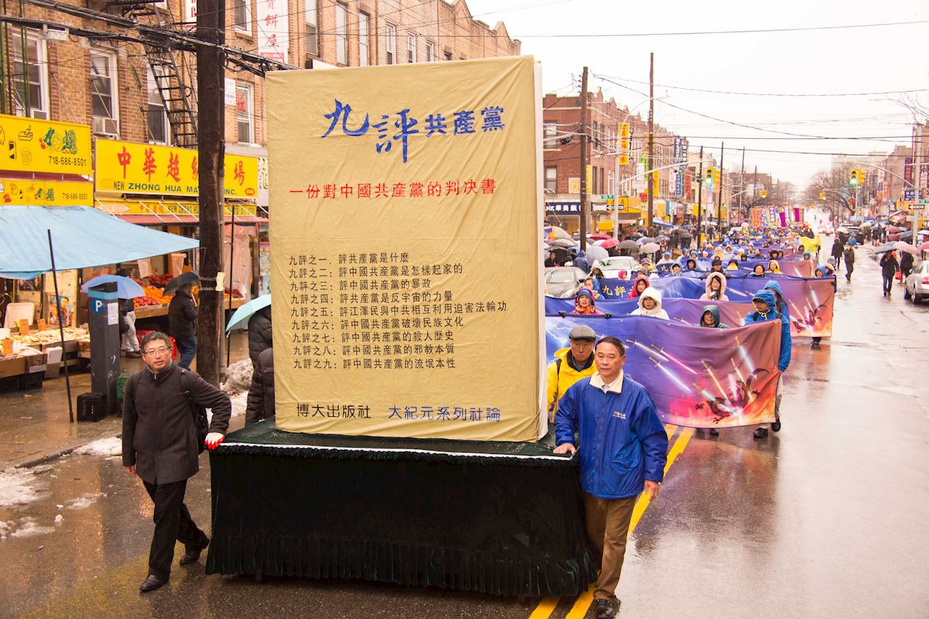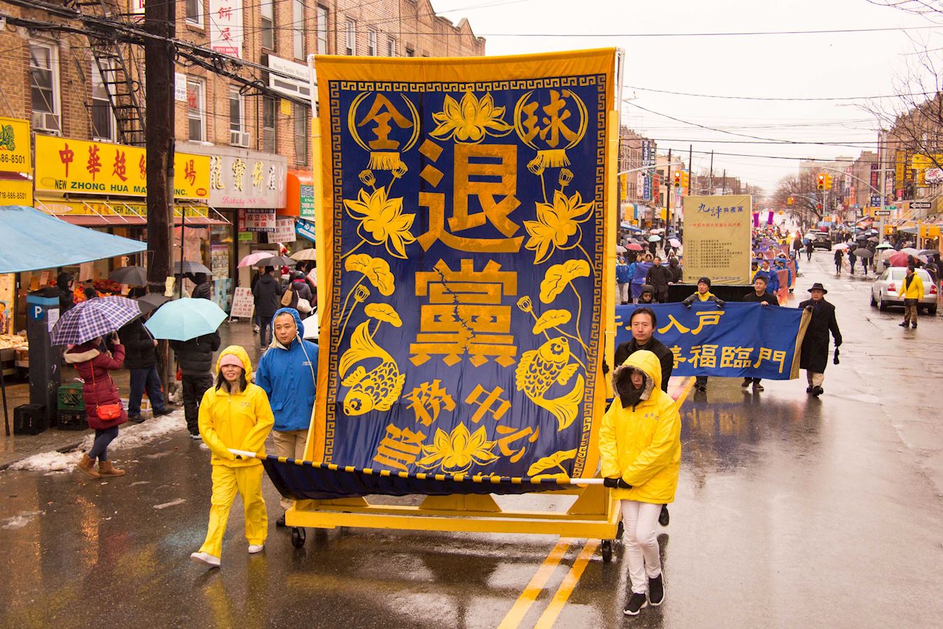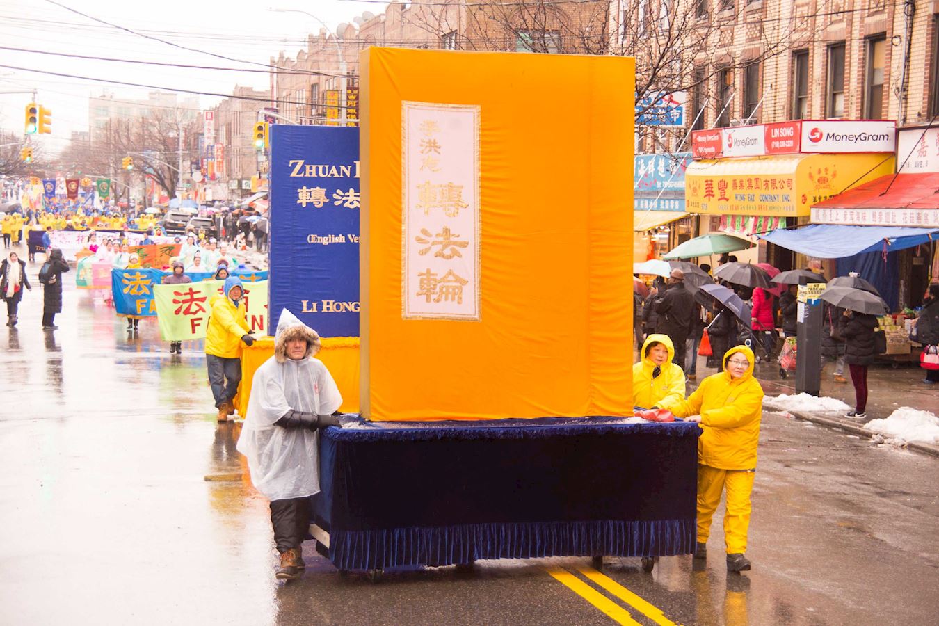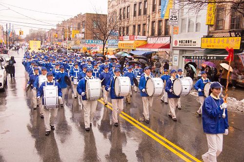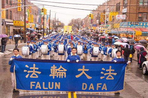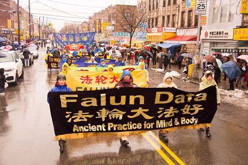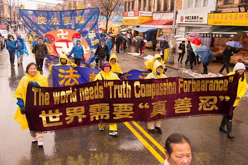 游行队伍分成三个方阵。第一个方阵是“法轮大法好”,由百名团员组成的天国乐团打头,演奏着《法轮大法好》、《送宝》等多个曲目。他们英姿飒爽地在八大道上前行,雄壮的鼓乐吸引行人停下匆忙的脚步,观看游行。 紧随其后的是超过两人高的巨型竖幅“法轮大法好”和中英文《转法轮》书籍模型,模型也有两人高。身着唐装的仕女手提镶有“真善忍”、“法轮功”的宫灯随后款款而行。几十条五彩缤纷的“法轮大法好”、“真善忍好”的横幅在八大道上浩浩荡荡的行进着。 第二方阵是呼吁“停止迫害法轮功”的队伍。两人多高的巨型竖幅“法办江泽民”,列举了迫害元凶江泽民犯下的“反人类罪”、“群体灭绝罪”、“酷刑罪”,以及活体摘取法轮功学员器官牟取暴利的罪行。走在其后的学员举着写有“SOS”的牌子,呼唤良知,共同制止这场迫害。 第三方阵是声援二亿六千万人三:退.的队伍。退!党!义工们举着写有各种标语的横幅,希望更多的华人“退!党!自救”,在新的一年迎来新的希望。 虽然天公不作美,民众却很热情。他们纷纷表示:“非常好看,新年好。这个游行很好。法轮大法好!” “挺壮观的,风雨无阻。” “很感动、很感动。” “很好很好,前面这个乐团很好,法轮功真好!” “法轮功的队伍每一年都在不断地壮大。我们通过这个游行可以看到法轮功是越来越得到美国人民,纽约人民和全世界人民的喜爱。” 风雨无阻救人急 游行负责人易蓉表示,虽然今天有雨雪,但还是坚持游行了,“因为比起中国大陆法轮功学员受到的迫害,这点苦实在不算什么。而且面对中共十多年的打压,我们都在风风雨雨中走过来了。” 同时,易蓉表示法轮功学员想把法轮大法的美好带给布鲁克林社区的民众。“其实法轮功对华人而言,真是应该感到骄傲的事情。法轮功从中国一直传到世界一百多个国家,是华人的骄傲。”她希望了解真相后的民众,都能选择正义、善良。