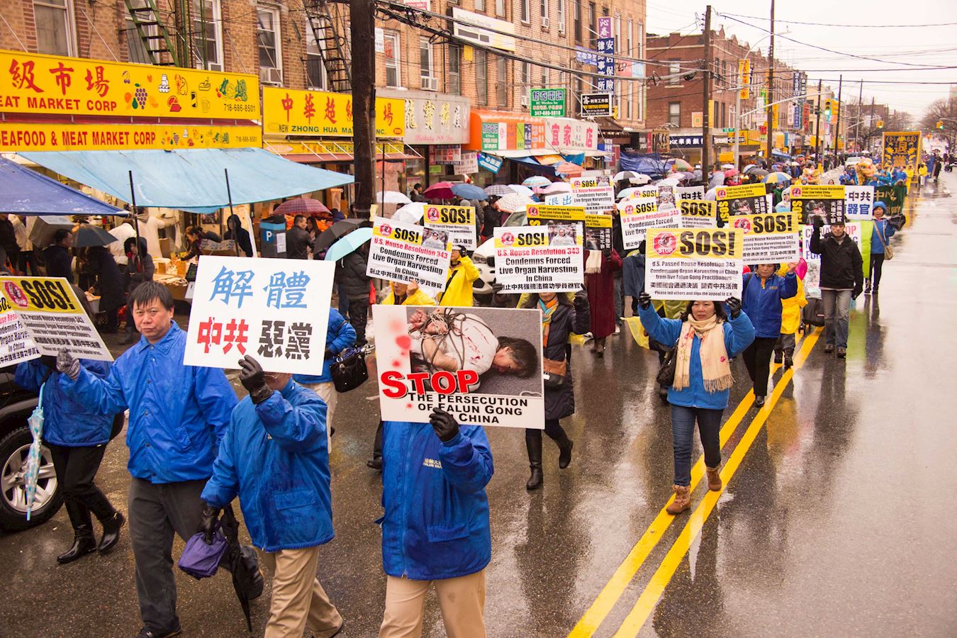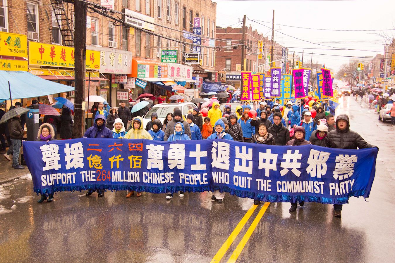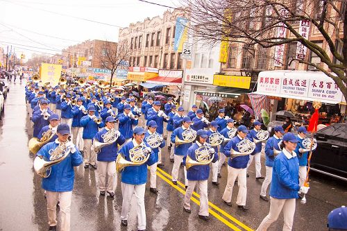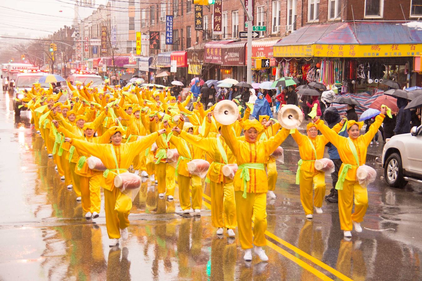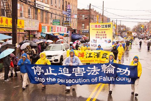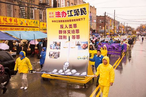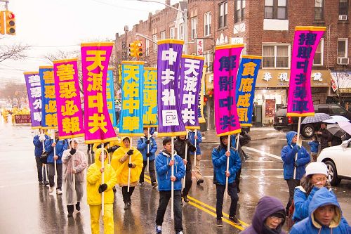 游行队伍分成三个方阵。第一个方阵是“法轮大法好”,由百名团员组成的天国乐团打头,演奏着《法轮大法好》、《送宝》等多个曲目。他们英姿飒爽地在八大道上前行,雄壮的鼓乐吸引行人停下匆忙的脚步,观看游行。 紧随其后的是超过两人高的巨型竖幅“法轮大法好”和中英文《转法轮》书籍模型,模型也有两人高。身着唐装的仕女手提镶有“真善忍”、“法轮功”的宫灯随后款款而行。几十条五彩缤纷的“法轮大法好”、“真善忍好”的横幅在八大道上浩浩荡荡的行进着。 第二方阵是呼吁“停止迫害法轮功”的队伍。两人多高的巨型竖幅“法办江泽民”,列举了迫害元凶江泽民犯下的“反人类罪”、“群体灭绝罪”、“酷刑罪”,以及活体摘取法轮功学员器官牟取暴利的罪行。走在其后的学员举着写有“SOS”的牌子,呼唤良知,共同制止这场迫害。 第三方阵是声援二亿六千万人三:退.的队伍。退!党!义工们举着写有各种标语的横幅,希望更多的华人“退!党!自救”,在新的一年迎来新的希望。 虽然天公不作美,民众却很热情。他们纷纷表示:“非常好看,新年好。这个游行很好。法轮大法好!” “挺壮观的,风雨无阻。” “很感动、很感动。” “很好很好,前面这个乐团很好,法轮功真好!” “法轮功的队伍每一年都在不断地壮大。我们通过这个游行可以看到法轮功是越来越得到美国人民,纽约人民和全世界人民的喜爱。” 风雨无阻救人急 游行负责人易蓉表示,虽然今天有雨雪,但还是坚持游行了,“因为比起中国大陆法轮功学员受到的迫害,这点苦实在不算什么。而且面对中共十多年的打压,我们都在风风雨雨中走过来了。” 同时,易蓉表示法轮功学员想把法轮大法的美好带给布鲁克林社区的民众。“其实法轮功对华人而言,真是应该感到骄傲的事情。法轮功从中国一直传到世界一百多个国家,是华人的骄傲。”她希望了解真相后的民众,都能选择正义、善良。