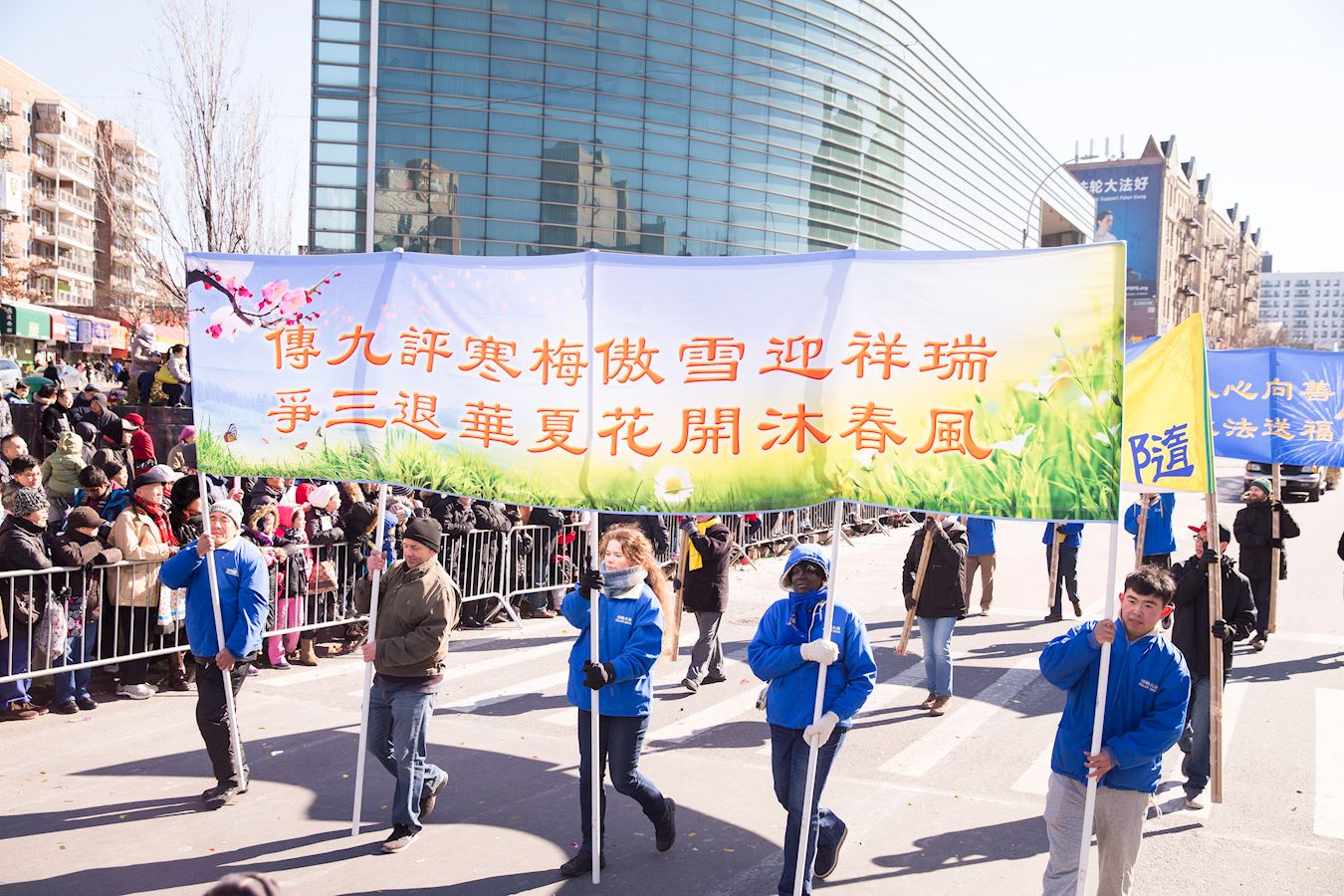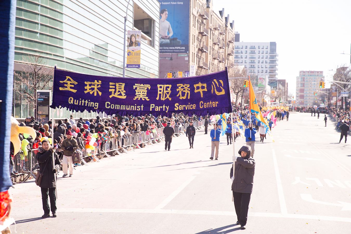 | 【明慧网二零一七年二月七日】(明慧记者采菊纽约综合报道)二零一七年二月四日,法拉盛举办了一年一度的“纽约华人新年大游行”,有一百个团体的上万人参加游行。当天,游行道路两旁挤满了围观的民众,“全球.退:党!服务中心”是压轴的方阵,欢乐的舞狮,精美的花车、亮丽的彩旗和喜庆的腰鼓队,给父老乡亲送去了金玉良言:“天要灭中共,三:退.保平安”。 游行观众叶先生:“本身三:退.就是非常好的,因为中共是邪恶的,所以应该要退出中共!” 一位观看游行的观众也说:“我支持你们。” 另一位游行观众则说:“我不是法轮功(学员),我支持(三:退.)因为我觉得,人要对得起自己的良知,要对得起自己的灵魂。有人是既没有良知又没有灵魂,所以他才会去拥抱共产党。” 游行观众丁女士表示:“我看了这边这个游行,我心里真的,很激动的。我就是讨厌共产党,因为它们是逆人的,可以说是逆文明的,可以说是逆人类的一个政权。真的应该被全球文明社会给取缔。如果中国真的能够成为一个文明的国家,民主的国家的话,那是全中国人的福祉。” 自二零零四年十一月《·九·评*共产党》发表,引发三:退.大潮,至今有近两亿六千万中国人抛却马列子孙,公开宣布退出曾经入过的中共党、团、队组织(简称:三:退.),争做中华儿女。根据退!党!网站,目前,每天有近十万大陆民众声明三:退.。 总部位于法拉盛的“全球.退:党!服务中心”主席易蓉表示,退!党!中心是法拉盛华人社区的一部份,在法拉盛街头有五个退!党!服务点为民众提供服务。全球.退:党!义工遍布世界各地,在世界各大旅游景点都可以看到他们的身影。随着中国人越来越明白真相,选择退出中共党团队的中国人像滚雪球一样不断增长,截止到二零一七年二月四日,已有二亿六千三百万中国人退出中共的党、团、队,说明中国人的人心发生巨变。 三:退.义工刘先生表示:“世人已经认清它(中共)是一个破坏人类传统道德文化的,最坏的政治流氓集团。” 前胜利油田计算中心工程师石女士认为,三:退.是民心所向。她说:“我们有一个党委书记,经过我们两个反复探讨,从马克思是撒旦教的教徒开始,从中国共产党这么多年迫害这么多中国人,控制中国人,而且恐吓中国人,甚至后来屠杀中国同胞。善恶有报,每个中国人都会相信这一点,那么从这一点,他想起码在老天爷面前,也给自己留条后路,他就选择了退出中共。” 易蓉强调:“今年是鸡年,俗话说,金鸡报晓,未来中国将发生巨变,上天一再给人机会,希望人们从退!党!义工苦口婆心的劝善中明白真相,作出选择。”