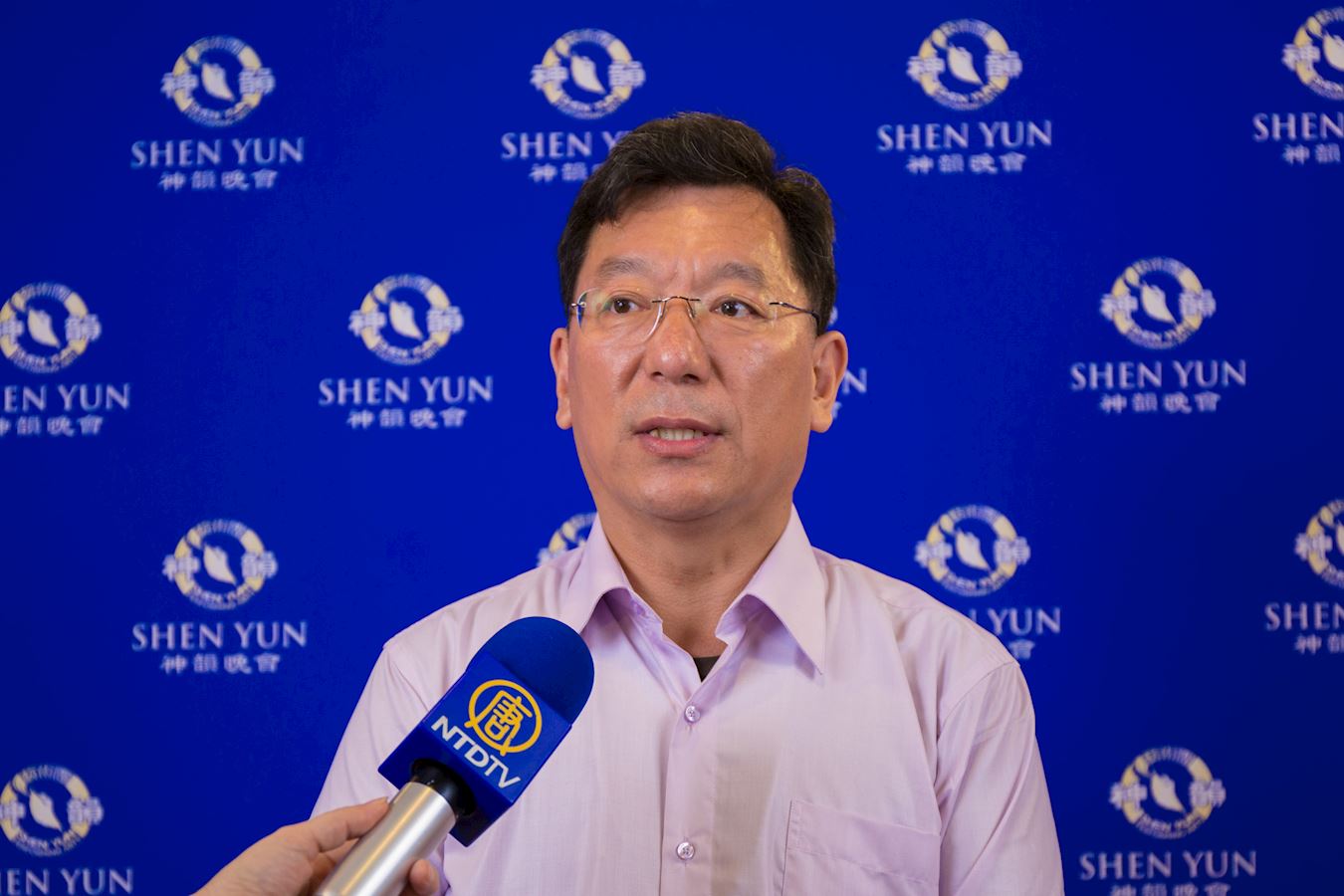 “震撼!真的是震撼!”台湾香蕉大王吴振瑞次子,电子、贸易与建筑公司的跨国企业家,也是悉尼大学建筑学院前院长吴庭光博士,三月十三日观赏神韵在高雄的演出后,对神韵出神入化的表演非常惊叹,他说:“好像有神助,她(神韵)已经是人类艺术的极致,真的不同凡响。” 慕名前来观赏神韵的吴庭光,曾负责澳洲悉尼歌剧院的设计建设工程,他常与其他演艺人员接触,也看过无数的表演,当看到神韵舞蹈展现高难度的技巧,赞叹:“一看就知道神韵高超的境界,他们从天幕中跳出来衔接到舞台的功夫,动作灵活又纯熟敏捷,那不是短时间可以锤炼出来的。” 他接着说:“她们每一个都象主角,每一个都可以当主角。很难得看到这么整齐的一群舞蹈演员,非常难得。” 他寻思舞蹈演员要达到如此超凡的境界,背后一定有强大的精神力量,“除了苦练之外,我想就是信仰,除非她们有心灵上的涵养,否则很难达到。” 民族舞节目《藏鼓豪情》也是吴庭光喜爱的节目之一,“打鼓,完全是真人在打真鼓,整齐的鼓声,又与交响乐团配合得天衣无缝,就是两个字:‘震撼!’” 吴庭光表示,“在艺术的涵养上,很难有团体能达到那么精良细致,个个像有‘神助’一样,她(神韵)已经是人类艺术的极致。” “真的不同凡响,我对艺术总监的敬佩,真是难以形容。我非常震撼,我觉得您真的像神一样,您的艺术已经是超越世界顶端,非常感激您,对现在这么污浊的世界,唤起‘真、善、忍’,把世界带到天堂,非常感激您对社会的奉献。” 全台巡演完美落幕 神韵传送正向能量  图10:财政部关务署基隆关稽查组组长罗文祯盛赞神韵呈现的光明,是全球都需要的正向力量。 |