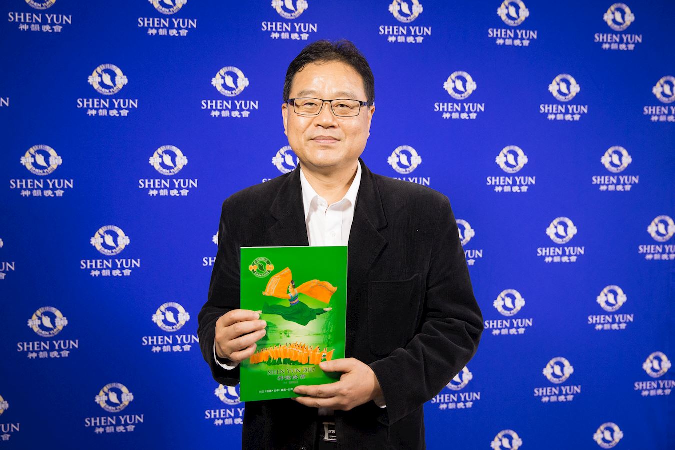 “神韵全方位展现艺术上的精实跟淬炼,这是一场生活、美学、艺术绝妙非凡的体验。”从去年十月聆赏神韵交响乐团后,多纳乐团团长郑镕苹就预约了这次(三月十四日)门票,看完后再度深感震撼。 当剧场灯光一暗,“咚!”锣声乍响,大幕一拉开,郑镕苹表示仿佛置身在仙国圣境无比美妙,她说:“非常的独特,格局宏大,气度非凡,感谢神韵带给我如此美妙的心灵悸动,谢谢!” 郑镕苹观察到神韵之所以震撼人心,除了高超的技术技巧外,最重要的是“心”的力量,她赞佩道:“神韵让我体会到,音乐除了是听觉的飨宴之外,更重要的是人内心修为的展现,这得从生活中一点一滴的淬炼。” “在《黄花仙秀》节目中,舞蹈演员的手在做飘浪的动作时,整体的波浪是一致的,跟音乐配合得天衣无缝;还有《绢花飞舞》的手绢一个抛的动作,然后配上钹的声音,整体的契合度非常的精准,美极了,让观众的艺术细胞都被激活。” “神韵在情感表达不管是亲子或是夫妻之情,甚至在师生方面的情意,当感情流泻时,音乐跟着感情走,感情也跟着音乐走,我的心也跟着悸动。” 当知道神韵从一个团发展到目前五个团在世界巡演,郑镕苹心生向往,期许自己向神韵学习、提升,更期盼有机会成为其中的一员。 跨国企业领袖:神助的艺术 极致的境界  图9:跨国企业领袖吴庭光非常惊叹:“好像有神助,她(神韵)已经是人类艺术的极致,真的不同凡响。” |