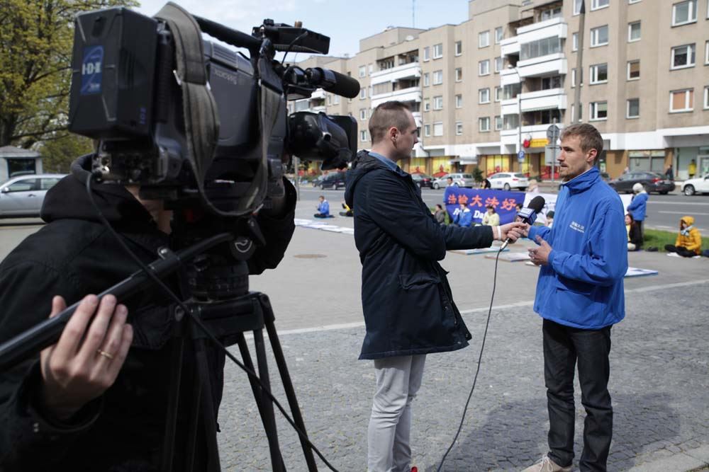 波兰法轮功学员黄先生和Mateuszem Filipkowskim先生对电视台记者详细介绍了当年“四二五”事件的经过和中共对法轮功的残酷迫害:一九九九年四月二十五日,为了向政府反映受到的不公正待遇,逾万名法轮功学员自发到北京国务院信访处和平上访。他们平和理性表达诉求方式,不仅让事态良性发展,也让妄图挑起事端的中共当权者的阴谋彻底破灭,此事震惊世界,各国媒体竞相报道,对法轮功学员赞誉有加。但是,中共独裁者却为此而感到权力受到挑战,由此开始构陷抹黑法轮功,诬陷法轮功学员“围攻中南海”,后来还摄制“天安门‘自焚’伪案”栽赃陷害法轮功。随后对法轮功的酷刑血腥迫害不断升级,其中最令人发指的迫害是对法轮功学员活体摘取器官的反人类罪。这十八年来,世界各地、包括中国大陆的法轮功学员面对中共铺天盖地的疯狂迫害,坚持“真、善、忍”的原则,广泛传播法轮功真相,并传播《·九·评*共产党》,让世界民众了解共产党的邪恶。法轮功目前在全世界一百多个国家和地区传播。 时至今日,积极参与迫害法轮功的元凶及帮凶纷纷遭报,已有超过二十万人以实名以群体灭绝罪及酷刑罪控告迫害元凶——中共前党魁江泽民。明白真相后的世界各国民众、国际组织及人权团体纷纷支持法轮功,目前全球已有三十个国家及地区、逾二百二十三万人参与刑事举报江泽民的联署行动,被外界称为是二十一世纪“全球最大的人权义举”。欧洲议会和美国议会先后通过决议谴责中共活摘器官的罪行。 波兰法轮功学员黄先生和Mateuszem Filipkowskim先生指出,很明显,现在大家都看到了,中共在迫害法轮功的滔天罪恶中走上了解体灭亡的不归路。而全世界民众都已见证了法轮功以坚忍不拔的精神和道德勇气抵御了人类历史上最为残暴的中共迫害,在中华民族的历史上树立了一座伟大的丰碑。 他们说:“我们在此呼吁波兰政府和民众关注真相,共同制止中共对法轮功的迫害。”  图5~9:纪念“四二五”十八周年,波兰法轮功学员在华沙古城讲真相活动,吸引众多民众驻足了解真相 |