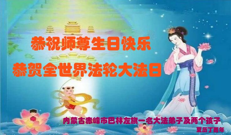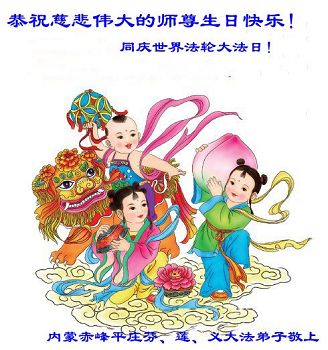 内蒙古赤峰市巴林左旗一名大法弟子及两个孩子恭祝师尊生日快乐!恭贺全世界法轮大法日!