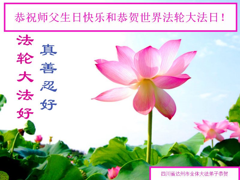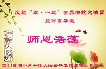 颂师恩 师尊慈悲救大穹, 洪微十方沐法光, 乾坤归正“新三才”, 普天同庆谢师恩。 师尊您好,师尊您辛苦了!此时此刻,用尽人类的语言,表达不尽我们对您的感恩,是您使我们明白了做人的理念、目地和责任,我们会努力兑现自己的誓约,一如既往的做好三件事。谢谢师尊的慈悲救度! 四川省阆中市全体大法弟子敬上 二零一七年四月二十九日 四川省达州市全体大法弟子恭祝师父生日快乐!和恭贺世界法轮大法日!