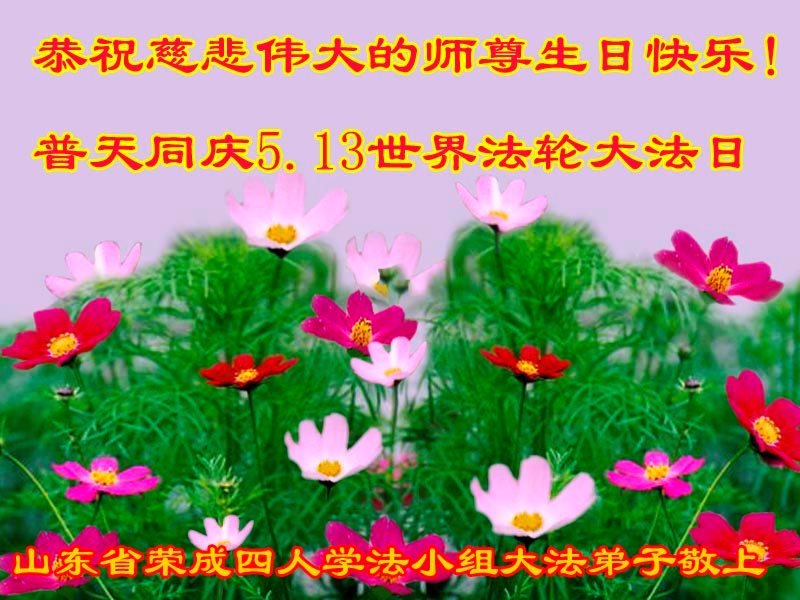 山东省荣成四人学法小组大法弟子恭祝慈悲伟大的师尊生日快乐!普天同庆5.13世界法轮大法日!
